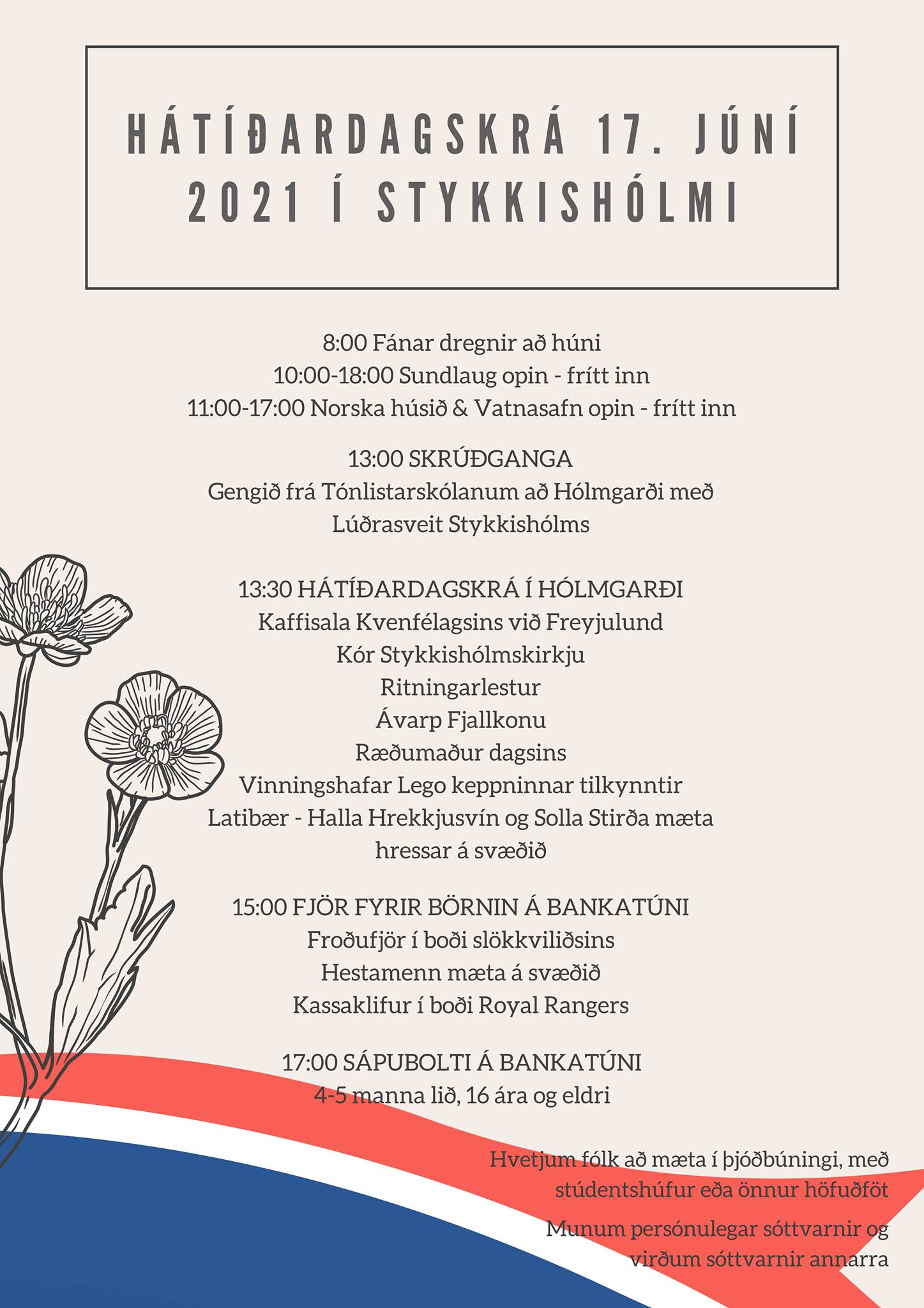 Þjóðhátíðardagur íslendinga verður haldinn hátíðlegur 17. júní í Stykkishólmi. Venju samkvæmt fer hátíðardagskráin fram í Hólmgarðinum og hefst kl. 13:30 eða þegar skrúðgangan kemur arkandi frá Tónlistarskóla Stykkishólms þaðan sem hún leggur af stað kl. 13:00.