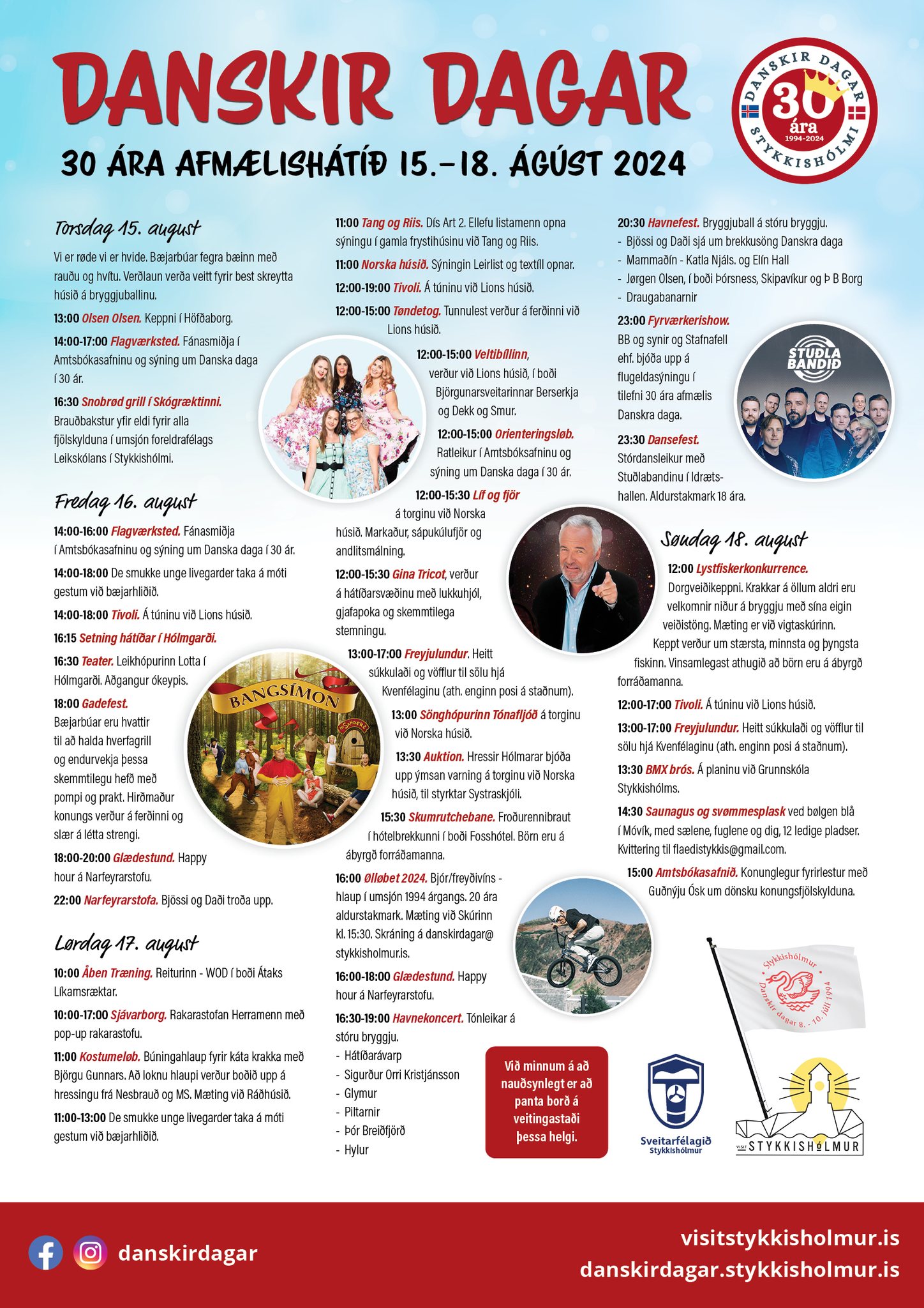 23:30 Dansefest. Stórdansleikur með Stuðlabandinu í Idrætshallen. Aldurstakmark 18 ára.