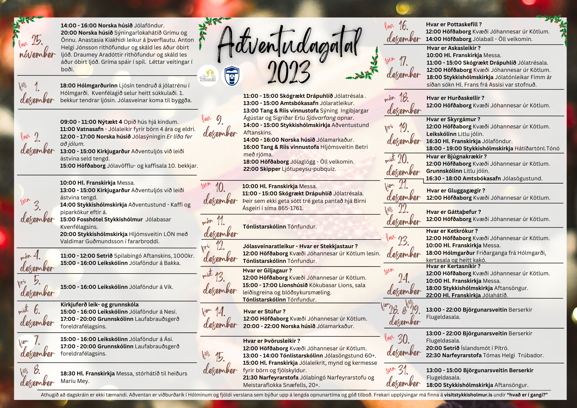 Í ljósi þess að dagskráin ratar ekki inn um bréfalúgur fyrir helgina er sérstök athygli vakin á því að mikið er um að vera næsta laugardag, 25. nóvember og víða lengdir opnunartímar verslana í Stykkishólmi. Einnig er vakin athygli á að fyrirhugað er að halda þrettándabrennu miðvikudaginn 6. janúar 2024 þó það komi ekki fram á dagatalinu. Nánari upplýsingar um það síðar.