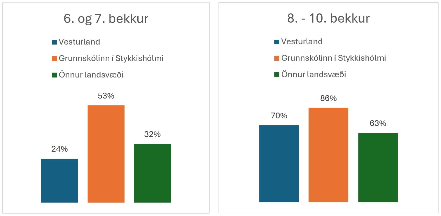 Hér að neðan má sjá súlurit sem sýna þátttöku ungmenna í starfi félagsmiðstöðva. Bláa súlan sýnir meðaltal af vesturlandi, græna meðaltal af landinu öllu og sú appelsínugula í miðjunni sýnir svör úr Grunnskólanum í Stykkishólmi.