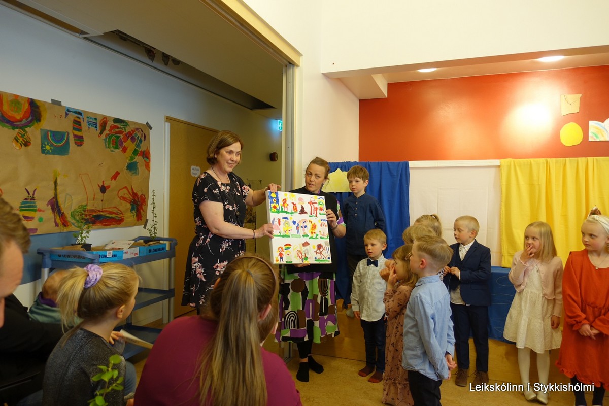 Góður tími fór í að undirbúa og æfa fyrir útskriftarhátíðina sem haldin var 25. maí. Þar sýndu börnin fjölskyldum sínum dagskrá sem samanstóð af skuggaleikhúsi með hljóðfæraslætti og söng, auk þess sem þau buðu upp á léttar veitingar sem þau höfðu undirbúið. Í lokin fengu þau viðurkenningu frá leikskólanum og einnig vegna vorskólans. Börnin afhentu Sigrúnu Erlu mynd sem þau höfðu málað af sér og mun hún koma henni vel fyrir í stofunni þeirra í grunnskólanum og mun myndin væntanlega fylgja þeim næstu árin í GSS. Það eru 17 nemendur sem flytja sig úr leikskólanum yfir í grunnskólann þetta árið. Við óskum þeim góðs gengis og þökkum þeim og fjölskyldum þeirra fyrir gott samstarf og ánægjulegan tíma í leikskólanum. Sjá má myndir frá þessum viðburðum á myndasíðu leikskólans.