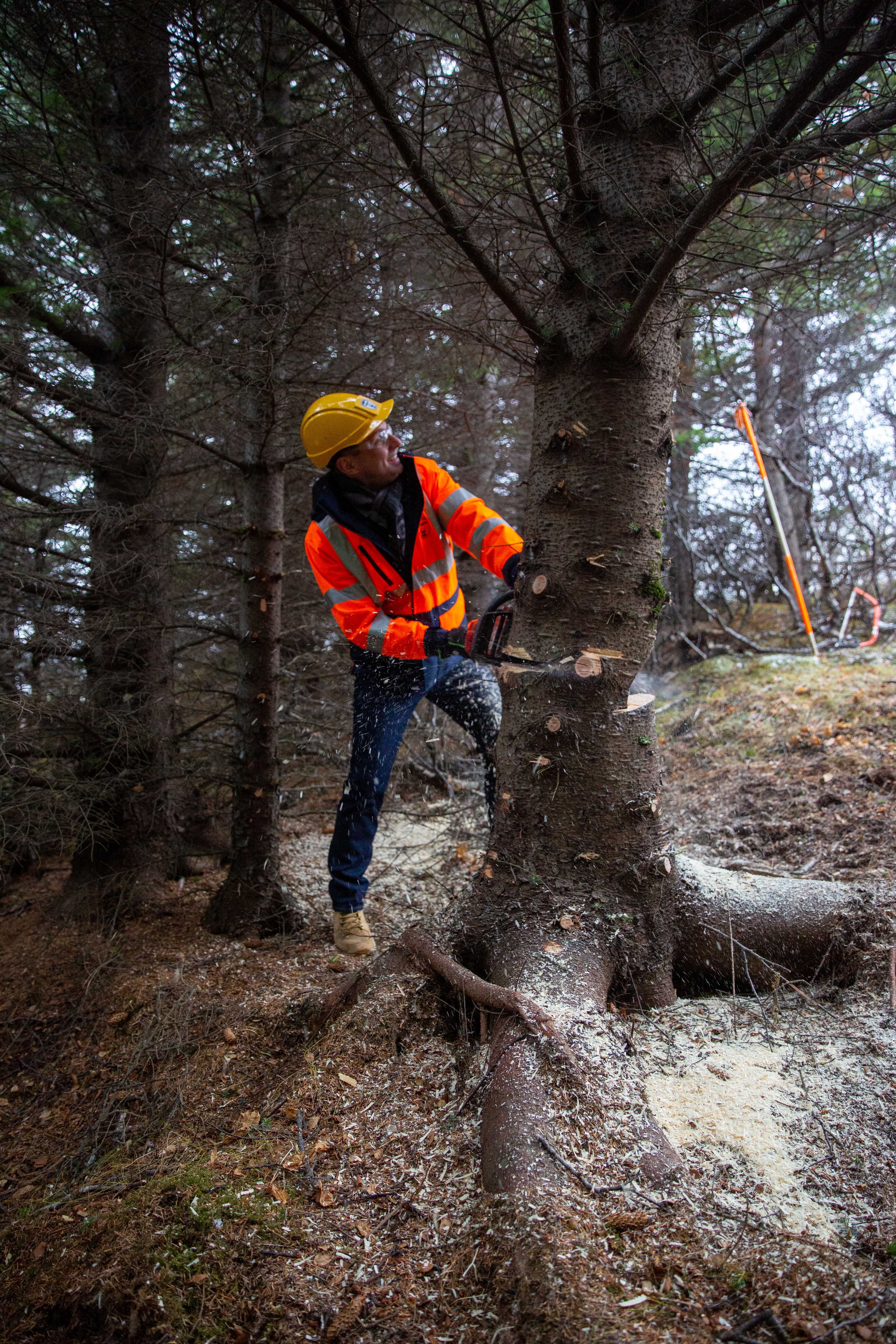 Eins og sjá má á myndunum hér að neðan lék bæjarstjóri husqvarna-keðjusög þjónustumiðstöðvarinnar öruggum höndum með tilsögn frá Jóni Beck, verkstjóra, þegar hann felldi tréð í fallegu veðri í Sauraskógi í síðustu viku.