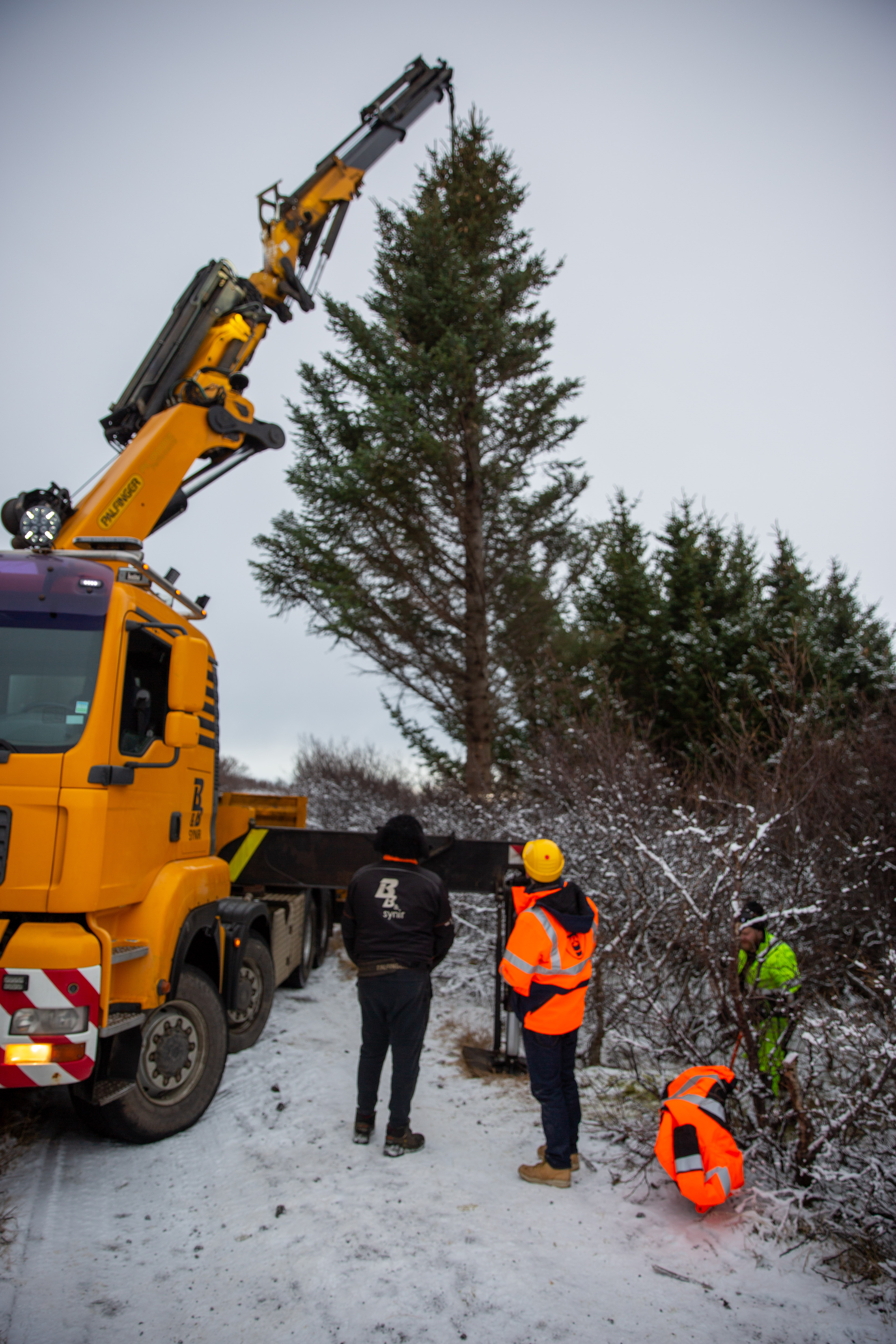 Eins og fram hefur komið völdu íbúar jólatréð í ár, valið stóð á milli stafafuru og sitkagreni og bar grenið sigur úr býtum. Þetta tignarlega tré, sem var gróðursett í Sauraskógi árið 1970, hefur nú verið sett upp í Hólmgarði.