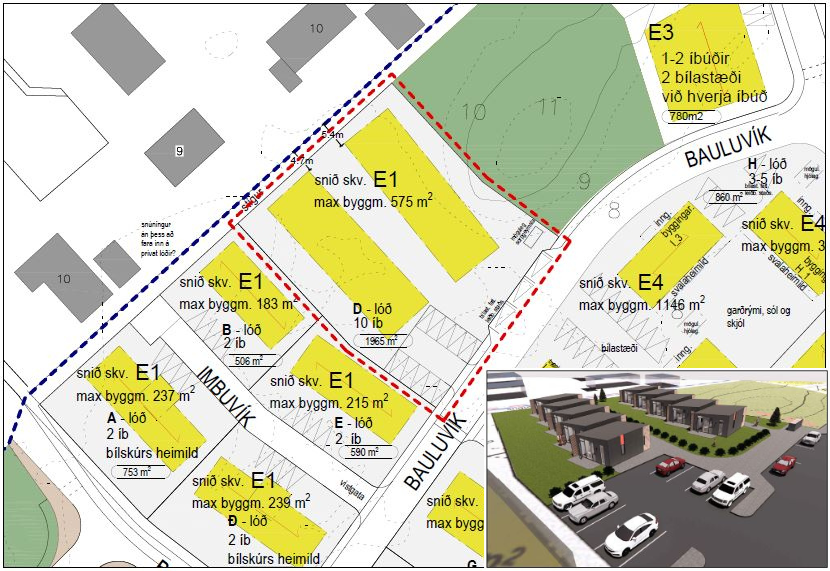 Skipulagsbreyting nær til lóðar D þar sem íbúðum fjölgar úr 4-6 í 10 íbúðir, byggingarreitur breytist þannig að 10 íbúðir passi betur á reitina og bílastæðum fjölgar úr 7 í 10.