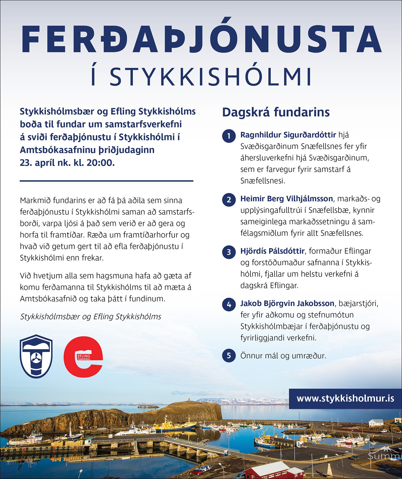 Stykkishólmsbær og Efling Stykkishólms boða til fundar um samstarfsverkefni á sviði ferðaþjónustu í Stykkishólmi í Amtsbókasafninu þriðjudaginn 23. apríl n.k. kl. 20:00.