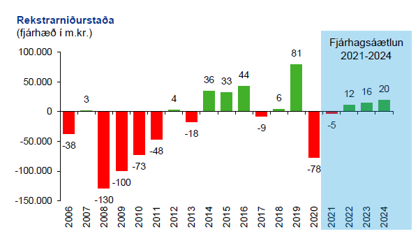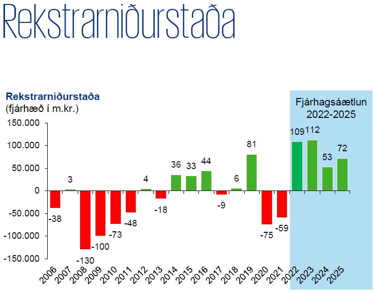 Á súluriti hér fyrir neðan má sjá yfirlit yfir rekstrarniðurstöðu Stykkishólmsbæjar (A og B hluta) árin 2006-2020 samkvæmt rauntölum, útkomuspá 2021 og fyrirliggjandi fjárhagsáætlun 2022-2025: