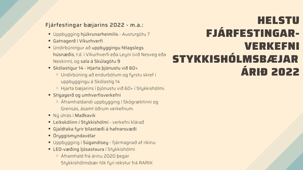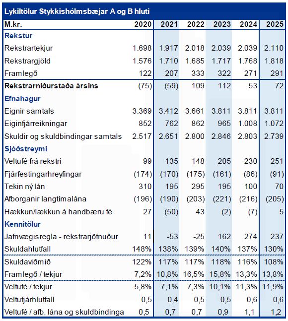 Verulegur jákvæður viðsnúningur verður í rekstri Stykkishólmsbæjar strax á næsta ári samkvæmt samþykktri fjárhagsáætlun Stykkishólmsbæjar 2022 og þriggja ára áætlun 2023-2025, gangi áætlanir eftir. Er um að ræða öfluga viðspyrnu í rekstri sveitarfélagsins, m.a. vegna sölu fastafjármuna í tenglum við áform um uppbyggingu nýrra félagslegra íbúða, eftir að mikilla áhrifa gætti í starfsemi og rekstri sveitarfélagsins vegna Covid-19 veirunnar, þó svo áfram sé gert ráð fyrir áhrifum hennar í áætlunum. FORSENDUR OG MARKMIÐ FJÁRHAGSÁÆTLUNAR Helstu lykiltölur fjárhagsáætlunar Stykkishólmsbæjar 2022-2025 (A og B hluti): ÁLAGNING Á ÍBÚA OG FYRIRTÆKI ? LÆKKUN Á FASTEIGNASKÖTTUM, LÓÐARGJÖLDUM OG HOLRÆSAGJÖLDUM Álagning fasteignaskatta í C-flokki (atvinnuhúsnæði) er óbreytt milli ára, þ.e. 1,57%, en álagningarprósenta lóðarleigu á atvinnuhúsnæðis lækkar úr 2,15% í 2,00% og þá mun jafnframt álagningarprósenta holræsagjalds húseigna í C-flokki lækka úr 0,21% í 0,20%. Álagning gjalds í B-flokki verða óbreytt milli ára. FJÁRFESTINGAR ? FJÁRFEST TIL FRAMTÍÐAR Í NAUÐSYNLEGUM INNVIÐUM Helstu fjárfestingar á árinu 2022 eru: Önnur framkvæmdarverkefni 2022 Fjárfestingar á árunum 2022 til 2025 nema um 86-175 m.kr. á ári að teknu tilliti til tekna vegna gatnagerðargjalda og styrkja. SKULDAVIÐ OG REKSTRARJÖFNUÐUR Hvað skuldahlutfall varðar þá hækkar það lítillega á árunum 2022 og 2023 en lækkar á árunum 2024-2025 og verður 130% í árslok 2025. Áætlað er skuldahlutfall í árslok 2021 verði 138%. Þannig er gert ráð fyrir að skuldahlutfall verði á svipuðum stað og það var á árunum 2016 og 2017 eða í sögulegu lágmarki. Hvað varðar jafnvægisreglu sveitarstjórnarlaga þá er vegna neikvæðri afkomu á Covid-19 árunum 2020 og 2021 þá er gert ráð fyrir því að rekstrarjöfnuður á árunum 2021-2022 verður neikvæður. Hins vegar er gert ráð fyrir jákvæðri rekstrarniðurstöðu árin 2022-2025 þannig að rekstrarjöfnuður nær jafnvægi á árunum 2023 til 2025. ÁFRAM BYGGT Á TRAUSTUM GRUNNI OG FJÁRFEST TIL FRAMTÍÐAR Umfjöllun um fjárhagsáætlun í bæjarstjórn (upptaka): Fjárhagsáætlun Stykkishólmsbæjar 2022 og þriggja ára áætlun 2023-2025: