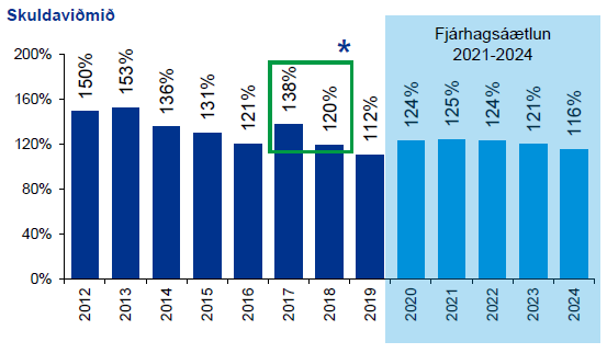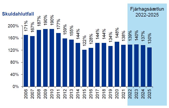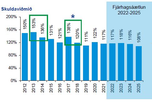 Samkvæmt áætlun er stefnt er að því að tryggja að skuldaviðmið og skuldahlutföll séu að lækka á tímabilinu. Hvað skuldaviðmið varðar þá er miðað við að heildarskuldir og skuldbindingar A og B hluta samkvæmt sveitarstjórnarlögum séu ekki hærri en sem nemur 150% af reglulegum tekjum. Þá er heimilt að taka tillit til sérstækra skuldbindinga sem heimilt er að draga frá heildarskuldum svo sem skuldbindinga vegna hjúkrunarheimila fyrir ríkissjóð og hluta lífeyrisskuldbindinga. Gangi áætlanir eftir mun skuldahlutfall og skuldaviðmið sveitarfélagsins lækka og gera áætlanir ráð fyrir að skuldaviðmið verði í kringum 117,4% strax í lok árs 2022 og 108,4% í árslok 2025.