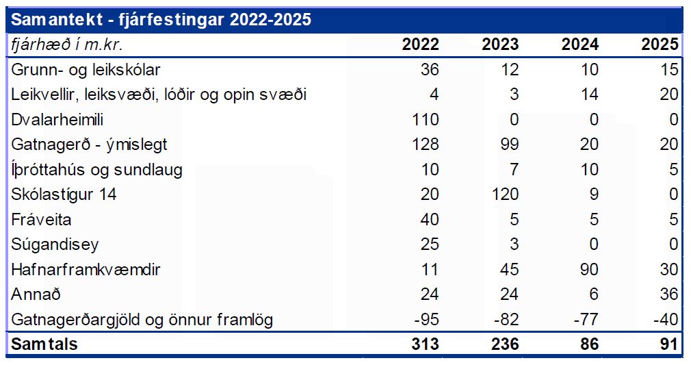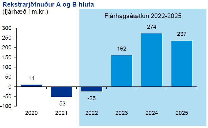 Markmið fjárhagsáætlunar 2022-2025 eru að tryggja jafnvægi í rekstri á tímabilinu, þ.e. að heildarútgjöld til rekstrar vegna A og B hluta séu á hverju þriggja ára tímabili ekki hærri en nemur samanlögðum reglulegum tekjum, framlegðarhlutfall verði um 16%, að veltufjárhlutfall nálgist 0,6 sem fyrst, handbært fé verði á bilinu 90-100 millj. í árslok 2022 og að rekstur skili nægjanlegum fjármunum til að standa undir afborgunum langtímalána. Fjárfestingaáætlun gerir ráð fyrir að heildarfjárfesting tímabilsins nemi 512,5 millj. kr., lántaka nemi 660 millj. kr. og afborganir nemi 844,5 millj. kr. Gangi áætlanir eftir mun skuldahlutfall og skuldaviðmið sveitarfélagsins lækka og gera áætlanir ráð fyrir að skuldaviðmið verði í kringum 117,4% strax í lok árs 2022 og 108,4% í árslok 2025.