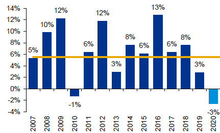 Til samanburðar má hér fyrir neðan sjá breytingu á útsvarstekjum á milli ára í sögulegu samhengi (frá 2007 til 2020):