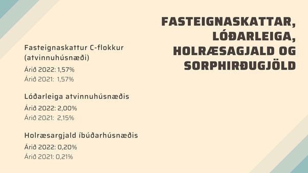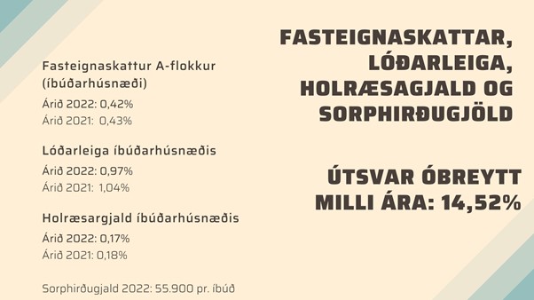 Helstu breytingar á álagningu íbúa eru þær að álagningarstuðull fasteignaskatta á íbúðarhúsnæði lækkar hjá Stykkishólmsbæ á árinu 2022 úr 0,43% í 0,42% og lækka álagningarprósenta lóðarleigu íbúðarhúsnæðis úr 1,04% í 0,97% ásamt lækkun á álagningarprósenta holræsagjalds húseigna í A-flokki verði 0,17%. Þannig er komið til móts við íbúa til þess að tryggja að heildarfasteignagjöld hækki ekki óhóflega vegna hækkunar á fasteignamati. Álagningarhlutfall úrsvars verður óbreytt milli ára.