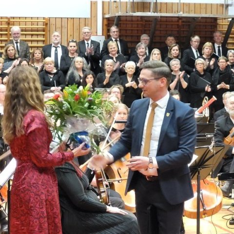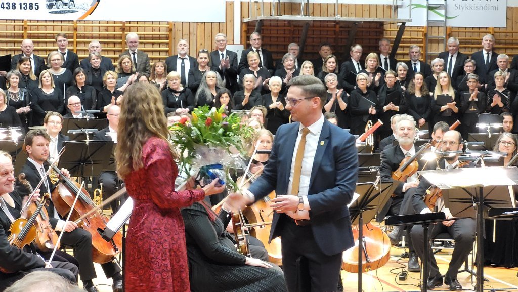 Áður en tónleikar hófust ávarpaði bæjarstjóri tónleikagesti þar sem hann bauð sveitina velkomna og fagnaði því sérstaklega að þjóðarhljómsveit Íslendinga legði land undir fót til að auðga tónmenningu landans. Bæjarstjóri fór í stuttu máli yfir ríka sögu tónlistarstarfs í Stykkishólmi og minnti á að nú í ár eru liðin 80 ár frá stofnun Lúðrasveitar Stykkishólms og 60 ár frá stofnun Tónlistarskóla Stykkishólms. Í ræðu sinni minntist bæjarstjóri einnig Sæbjörns Jónssonar sem hóf sitt tónlistanám í Stykkishólmi og lék með Lúðrasveit Stykkishólms, en síðar Sinfóníuhljómsveit Íslands í 35 ár. Að lokum færði bæjarstjóri framkvæmdastjóra hljómsveitarinnar og kórstjórnendum blóm í þakklætisvott.