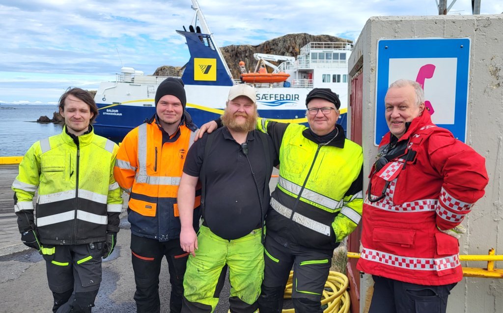 Fyrsta skemmtiferðaskip sumarsins er komið í höfn í Stykkishólmi. Móttökurnar voru ekki af verri endanum en það voru þeir Jón Beck, Jón Jakob, Jón Páll, Einar Strand og Ingvar sem tóku á móti skipinu með bros á vör.