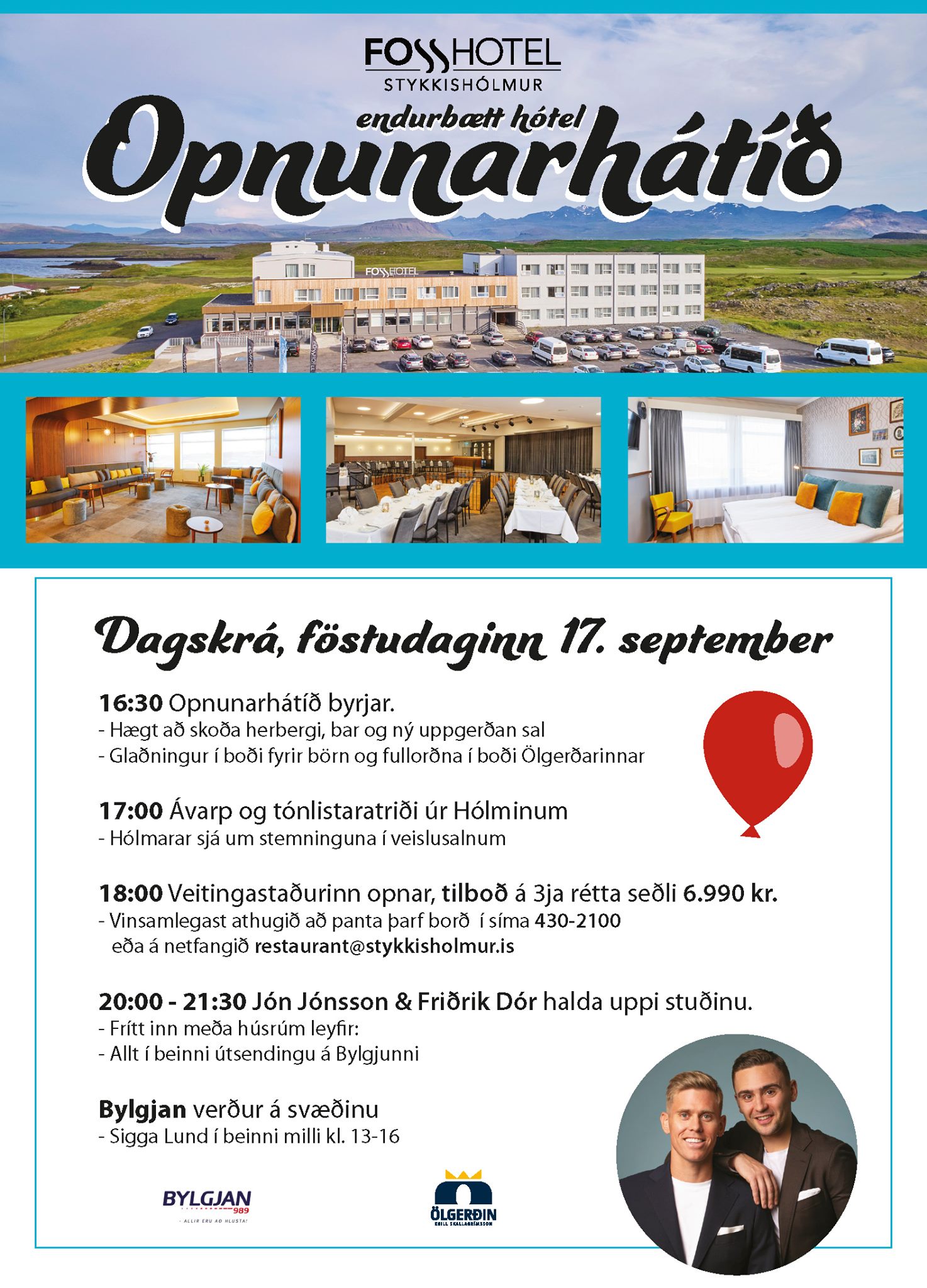 Næstkomandi föstudagskvöld mun Bylgjan útvarpa tónleikum með Jóni Jónssyni og Friðriki Dór í beinni útsendingu frá Fosshótel Stykkishólmi. Tónleikarnir eru haldnir í tilefni af opnun á nýendurbættum ráðstefnu-, tónleika- og veislusal á hótelinu og hefur Fosshótel Stykkishólmur boðið Hólmara sérstaklega velkomna á opnunarhátíð hótelsins komandi föstudag. Á hátíðinni koma fram ýmsir Hólmarar og flytja bæði tónlistaratriði og ávörp. Hátíðin hefst kl. 16:30, dagskrá má kynna sér hér að neðan.