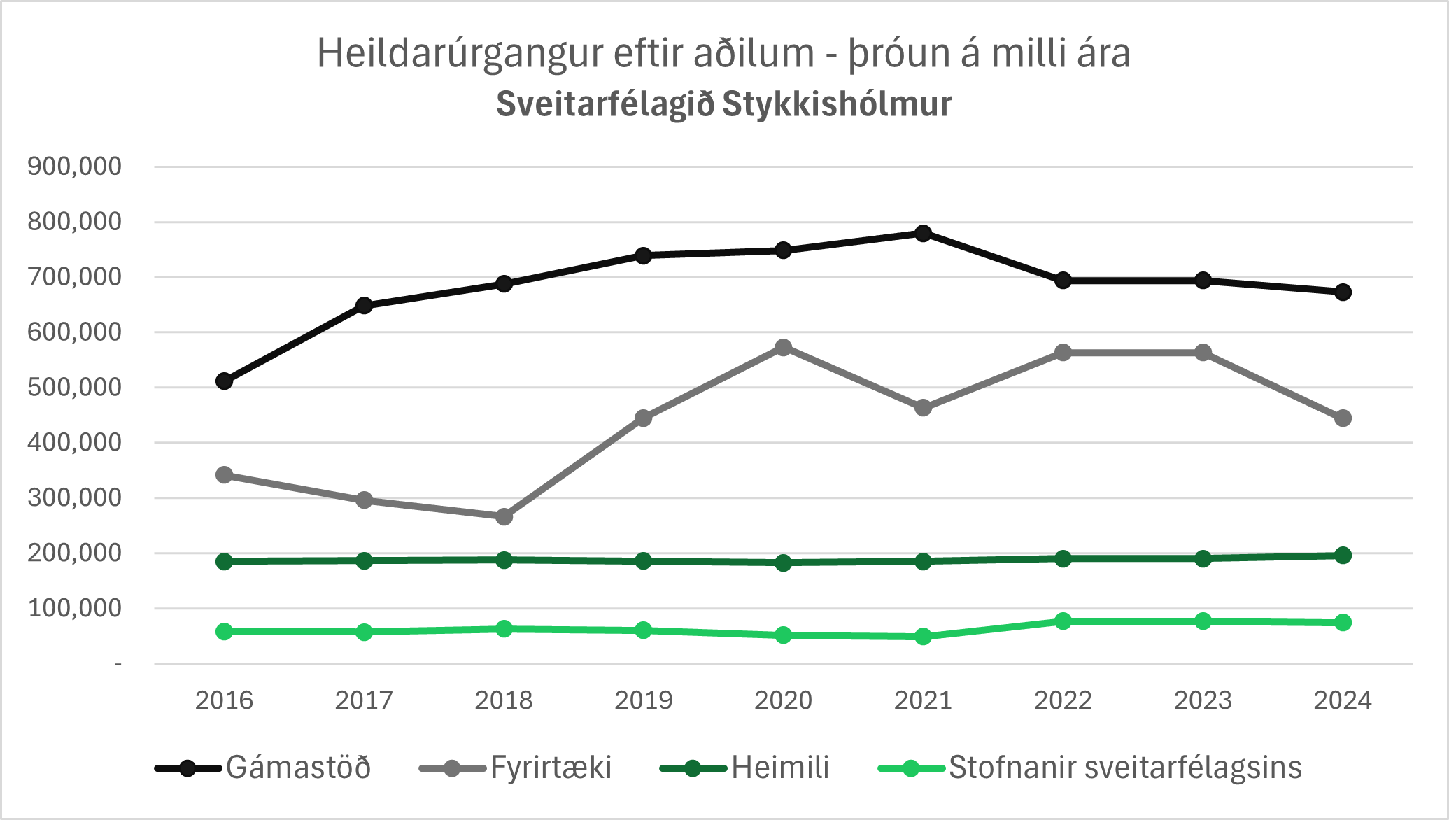 Heildarúrgangur eftir aðilum, þróun á milli ára, 2016-2024. Ýmislegt getur haft áhrif á sveiflur á milli ára; framkvæmdir, ferðaþjónusta, upp- eða niðursveifla í iðnaði og efnahagsástand í samfélaginu. Magntölur eru frá Íslenska gámafélaginu, tölfræði unnin af verkefnastjóra umhverfisvottunar Snæfellsness.