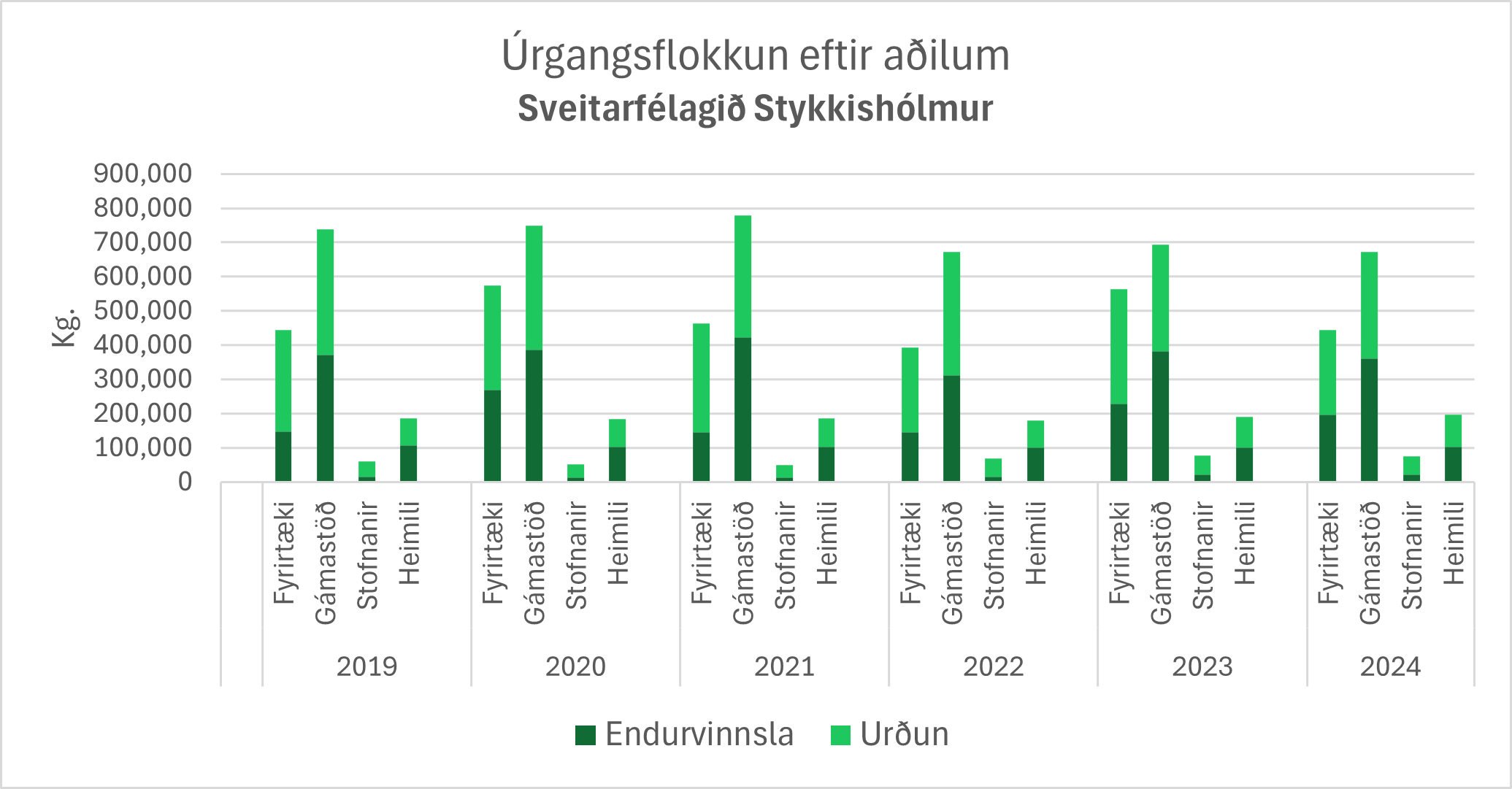 Flokkun úrgangs árin 2019 – 2024 eftir aðilum: Fyrirtæki, gámastöð, stofnanir sveitarfélagsins og heimili. Magntölur eru frá Íslenska gámafélaginu, tölfræði unnin af verkefnastjóra umhverfisvottunar Snæfellsness.