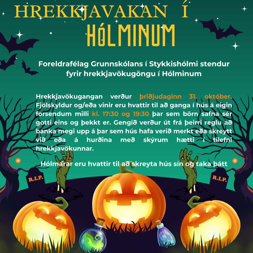 Hrekkjavakan verður haldin víðsvegar um heim þriðjudaginn 31. október en hátíðin fer sífellt vaxandi hér á landi. Á hrekkjavöku er hefð fyrir því að börn klæði sig upp í búning og gangi í hús í leit að sælgæti. Foreldrafélag Grunnskólans í Stykkishólmi stendur fyrir hrekkjavökugöngu í Hólminum og hvetur fjölskyldur og vini til að ganga í hús á milli kl. 17:30 og 19:30 þriðjudaginn 31. október og safna sér sælgæti. Gegnið verður út frá þeirri reglu að börn megi banka upp á þar sem hús hafa verið skreytt eða merkt í tilefni af hrekkjavökunni.