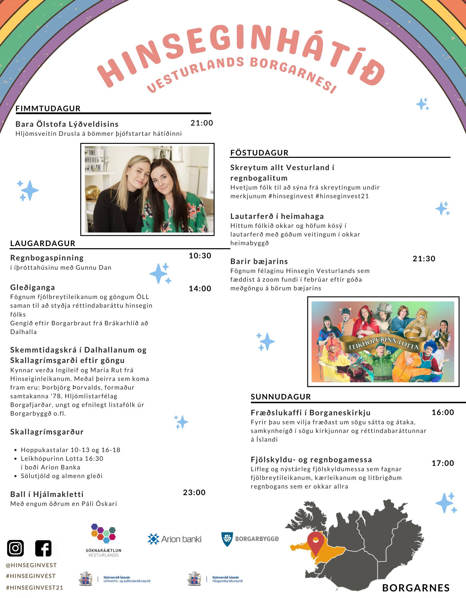 Hinseginhátíð Vesturlands er styrkt af Uppbyggingarsjóði Vesturlands, Menningarsjóði Borgarbyggðar og félags- og barnamálaráðherra