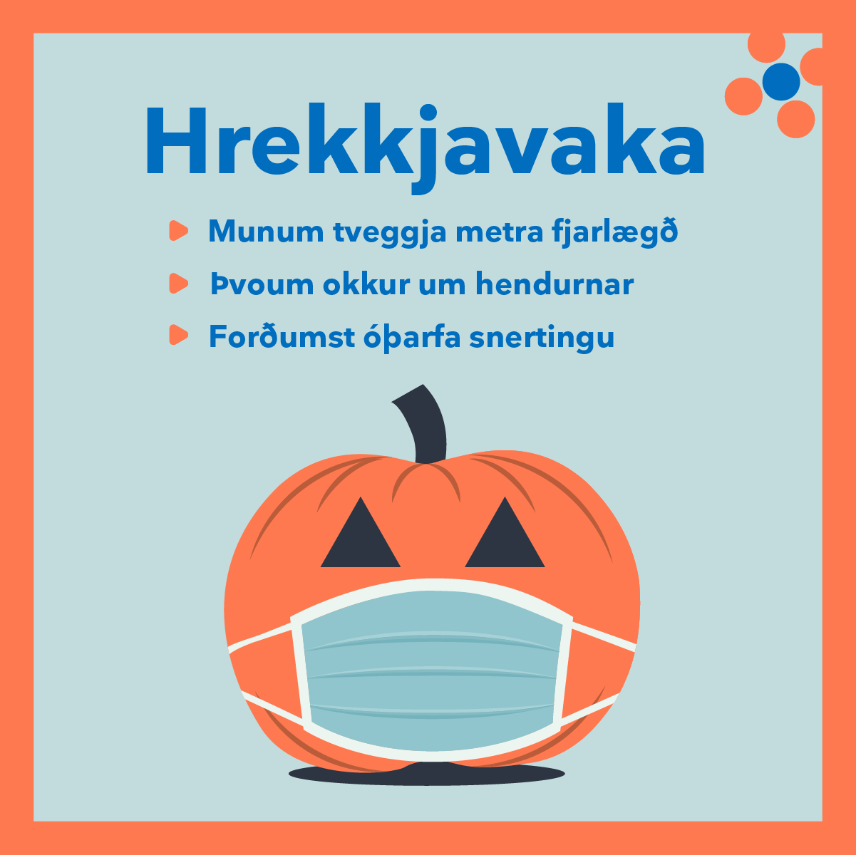 Hrekkjavaka verður laugardaginn 31. október en hátíðin fer sífellt vaxandi hér á landi. Á hrekkjavöku er hefð fyrir því að börn klæði sig upp í búning og gangi í hús með og fái sælgæti. Í ljósi þess að hefðinni fylgja margir snertifletir sem auðvelda smitleiðir veirunnar hefur almannavarnardeild ríkislögreglustjóra hvatt fólk til að leita annara leiða til að gera sér dagamun á hrekkjavökunni.