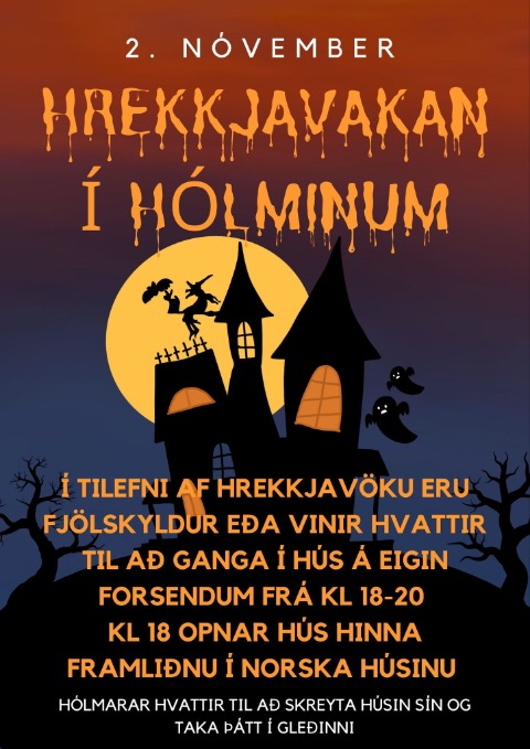 Ákveðið var að fresta Hrekkjavökunni í Stykkishólmi þar sem grunnskólinn er í vetrarfríi og mörg börn ekki heima 31. október. Þess í stað verður blásið til leiks miðvikudaginn 2. nóvember. Fjölskyldur og vinir eru hvattir til að ganga í hús á eigin forsendum milli kl. 18 og 20 þar sem börn safna sér sælgæti, eins og þekkt er. Gengið verður út frá þeirri reglu að banka megi uppá þar sem hús hafa verið merkt eða skreytt við eða á hurðina með skýrum hætti í tilefni Hrekkjavökunnar.