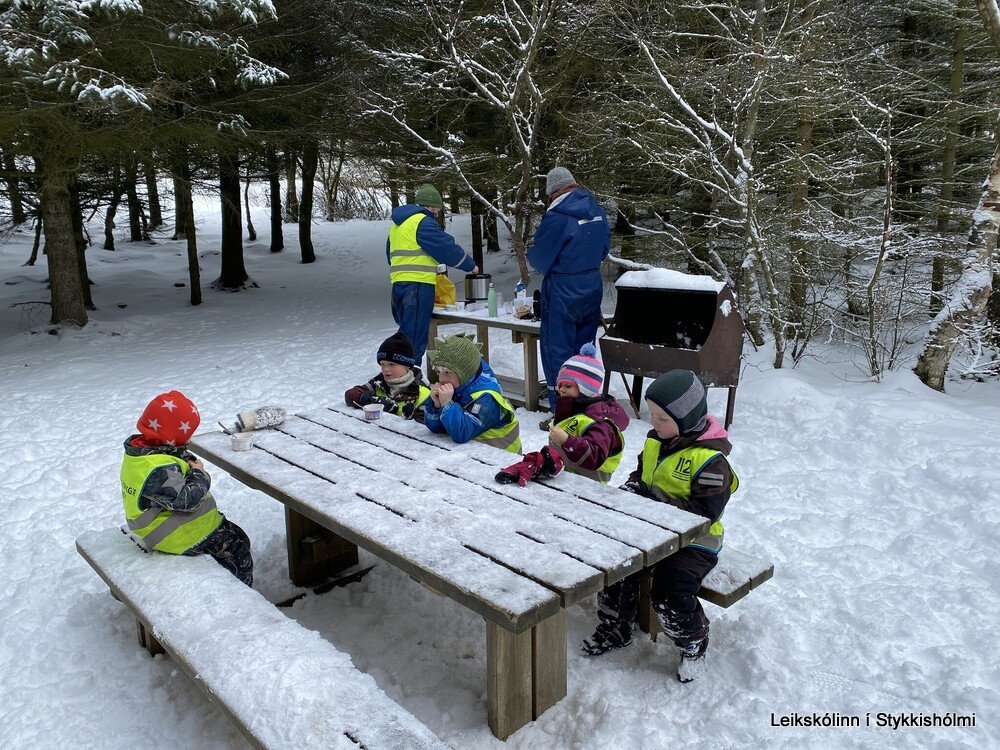 Á þessum undarlegu tímum sem við nú upplifum hefur aldeilis komið sér vel sú ákvörðun leikskólans að hefja útikennslu og nýta þannig svæðið okkar og mannauðinn í leikskólanum. Þarna er auka kennslustofa sem tveir elstu árgangar leikskólans nýta sér í smáum hópum, hver hópur einn dag í viku. Í maí síðast liðnum hófust tilraunir með þessa kennslu sem hefur verið í sífelldri þróun síðan. Þessi mynd var tekin í hádeginu í dag þegar börnin fengu matarsendinguna sína, sjóðheita íslenska kjötsúpu og svo er auðvitað vel við hæfi að fá sér heitt kakó líka. Það er skemmst frá því að segja að börnin kunna vel að meta skógarferðirnar og þá dásemdar upplifanir sem Nýræktin okkar hefur upp á að bjóða.