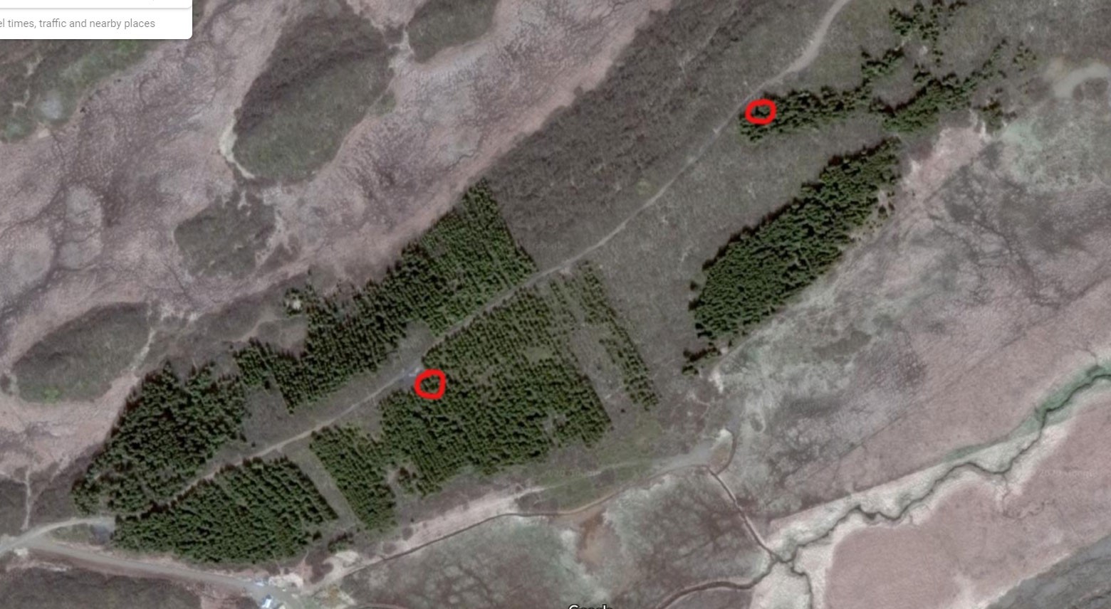 Hér að neðan má sjá myndir af trjánum sem valið stendur á milli ásamt staðsetningu á korti og GPS hnitum. Bæði tré hafa verið vel merkt svo ekki fari á milli mála hvaða tré koma til greina. Nú er því um að gera fyrir Hólmara að fá sér göngu í Sauraskógi og skoða bæði tré gaumgæfilega áður en valið er.