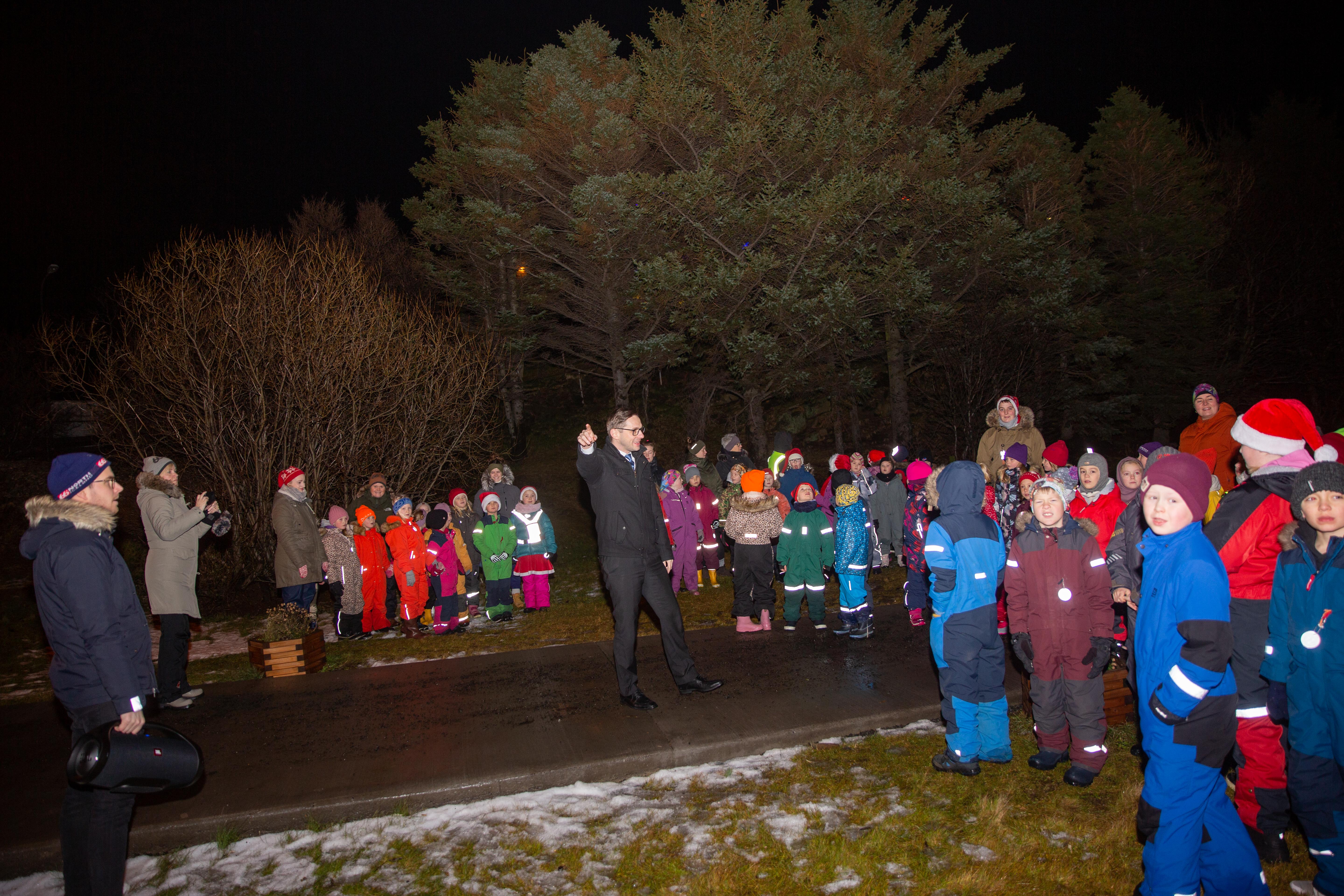 Bæjarstjóri tók á móti börnunum þegar þau mættu í Hólmgarðinn og sagði þeim m.a. frá því að nú væri jólatréð íslenskt en ekki innflutt frá Noregi eins og löng hefð hefur verið fyrir. Börnin skemmtu sér vel í garðinum og voru hæstánægð með gjöfina frá Bjúgnakræki og bræðrum hans. Eins og vant er voru spiluð jólalög og dansað í kringum tréð eftir að ljósin voru tendruð eins og sjá má á myndum hér að neðan.