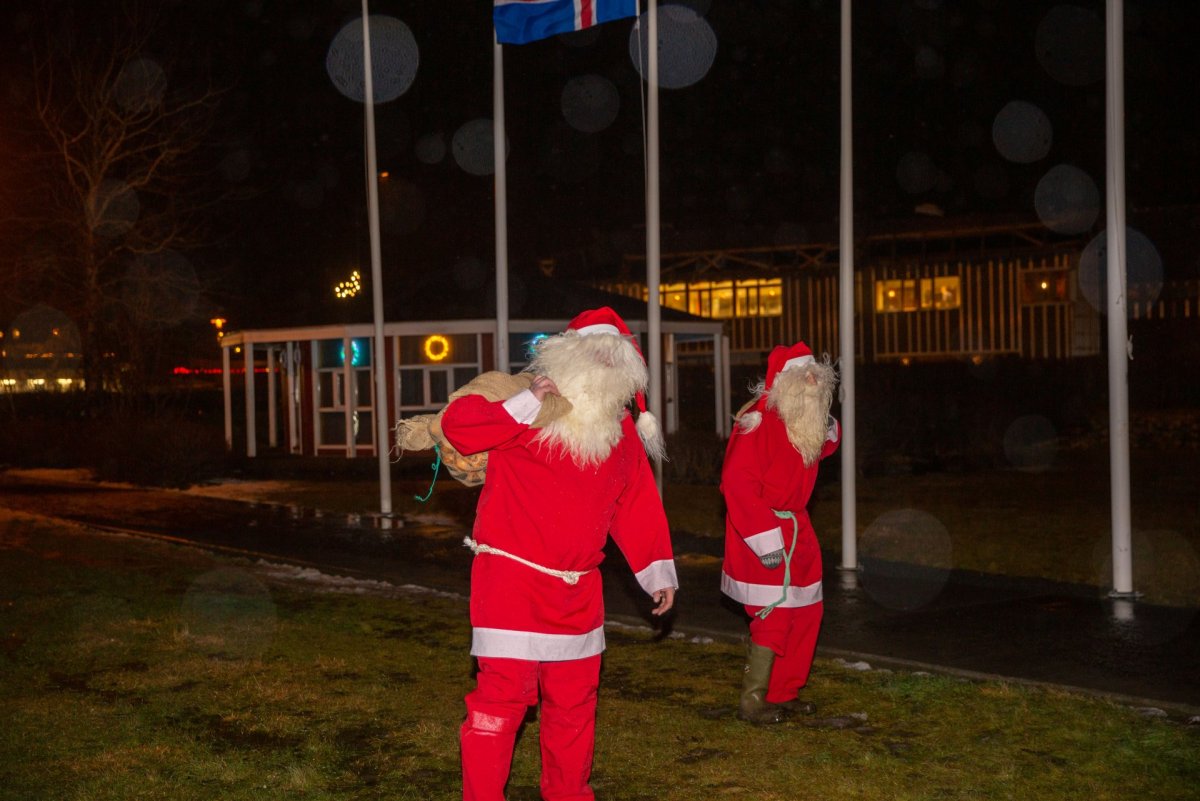 Tveir jólasveinar, þeir Bjúgnakrækir og Gluggagægir, gengu á hljóðið þegar börnin sungu saman jólasöngva í garðinum. Þeir komu færandi hendi og gáfu viðstöddum mandarínur og gáfu þar að auki öllum börnum í Stykkishólmi sleða sem stendur nú í Hólmgarði og verður þar yfir hátíðarnar. Samkvæmt Bjúgnakræki er þarna um að ræða gamlan sleða sem þeir bræður hafa ekki not fyrir lengur og þótti honum því tilvalið að gefa börnum í Hólminum sleðann að gjöf. Til gamans málaði hann mynd af jólasveini, snjókarli og hreindýri og lét fylgja sleðanum.