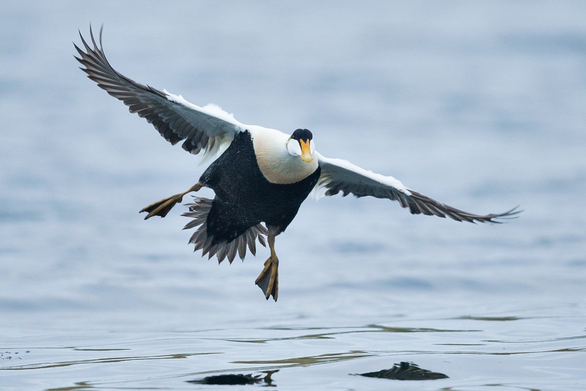 Ljósmynd: Æðarbliki kemur inn til lendingar í Landeyjarsundi við Stykkishólm. Ekki er hægt að fjalla um fuglalífið við Breiðafjörð án þess að æðarblikinn sé þar í heiðurssæti.