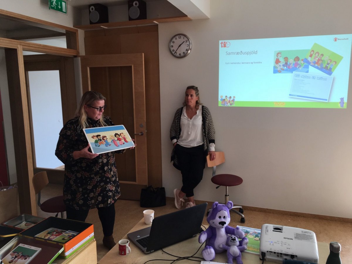 Starfsmenn leikskólans sátu námskeið á skipulagsdegi 19. ágúst s.l. þar sem viðfangsefnið var ,,Vinátta - eineltisverkefni Barnaheilla" og bangsinn Blær. Eins og áður hefur komið fram í leikskólafréttum þá gaf Kvenfélagið Hringurinn hér í Stykkishólmi okkur námsefnið fyrir eldri börnin s.l. haust og á vormánuðum var gjafafé frá Lionsklúbbi Stykkishólms m.a. notað til að kaupa námsefnið fyrir yngri börnin. Alla tónlistina í verkefninu má finna á Spotify ef leitað er eftir ,,Vinátta". Það voru þær Linda Hrönn Þórisdóttir verkefnastjóri hjá Barnaheill og Kristín Gísladóttir leikskólastjóri Uglukletts í Borgarnesi sem leiðbeindu starfsmönnum leikskólans þennan dag, en Ugluklettur var einn af þeim leikskólum sem prufukenndu námsefnið í upphafi og hefur náð góðum árangri með það. Sjá nánar á https://www.barnaheill.is/is/forvarnir-og-fraedsla/vinatta