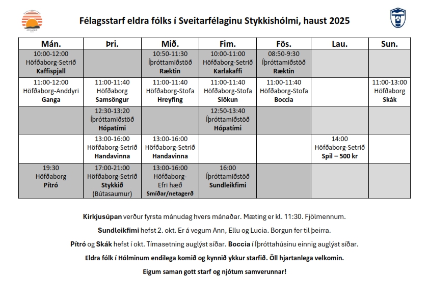Félagsstarf eldra fólks í Stykkishólmi er komið aftur af stað eftir sumarið. Ný dagskrá fyrir starfið er komin út en þar ættu allir að finna eitthvað við sitt hæfi.
