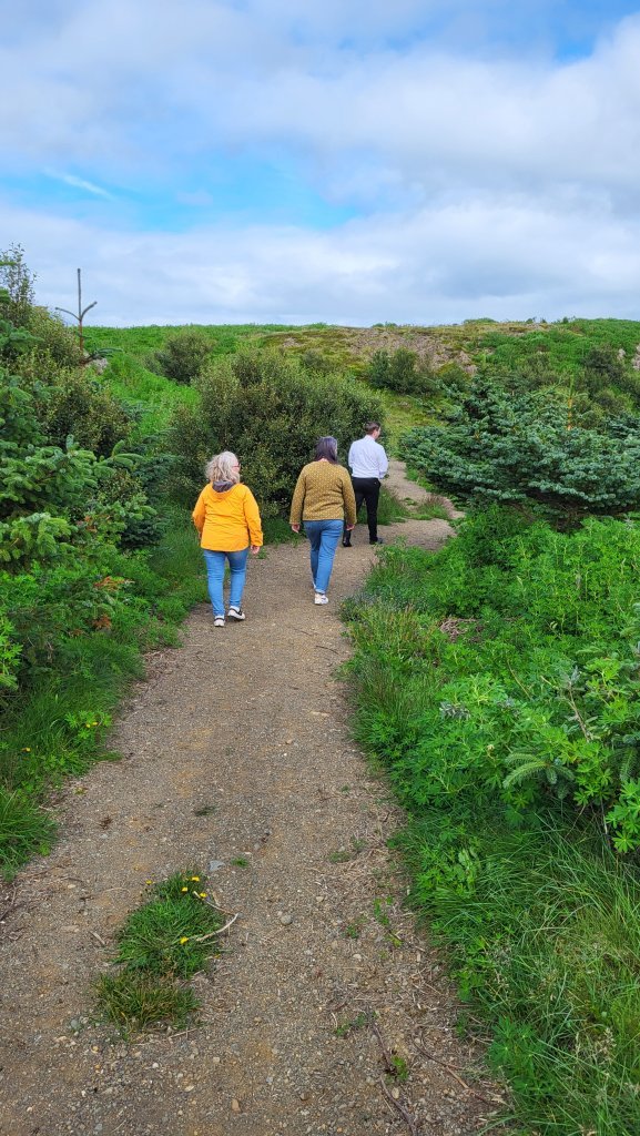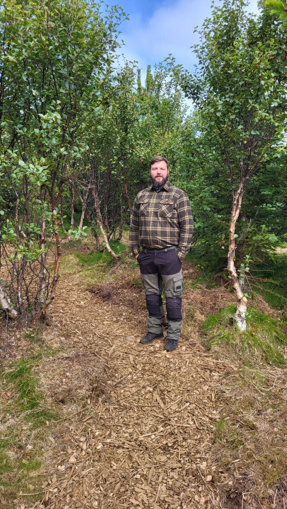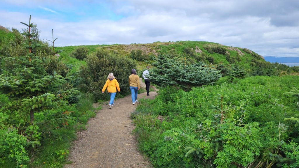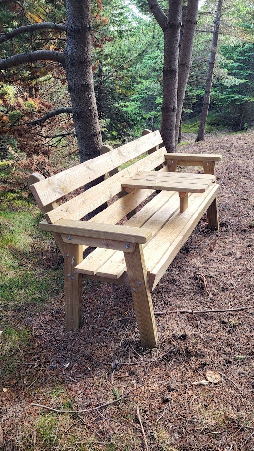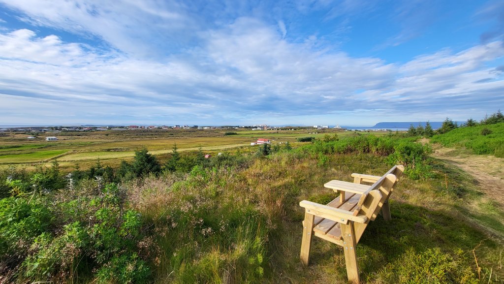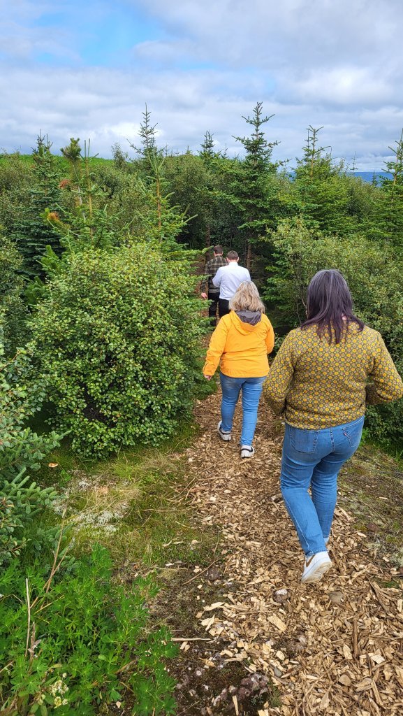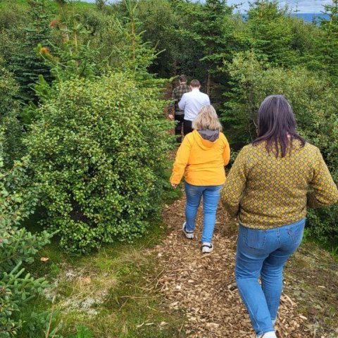 Við göngustígana í Nýrækt hefur nýjum bekkjum víða verið komið fyrir sem margir hverjir eru útbúnir litlu borði sem hentar vel undir kaffi og nesti. Myndirnar hér að neðan voru teknar þegar Björn Ásgeir, formaður Skógræktarfélagsins, gekk með bæjarráð og bæjarstjóra um svæðið nú á dögunum og ræddi framtíðaráform félagsins. Á fyrstu myndunum er einnig hluti samfélagsflokksins sem vann þrekvirki í skóginum í sumar.