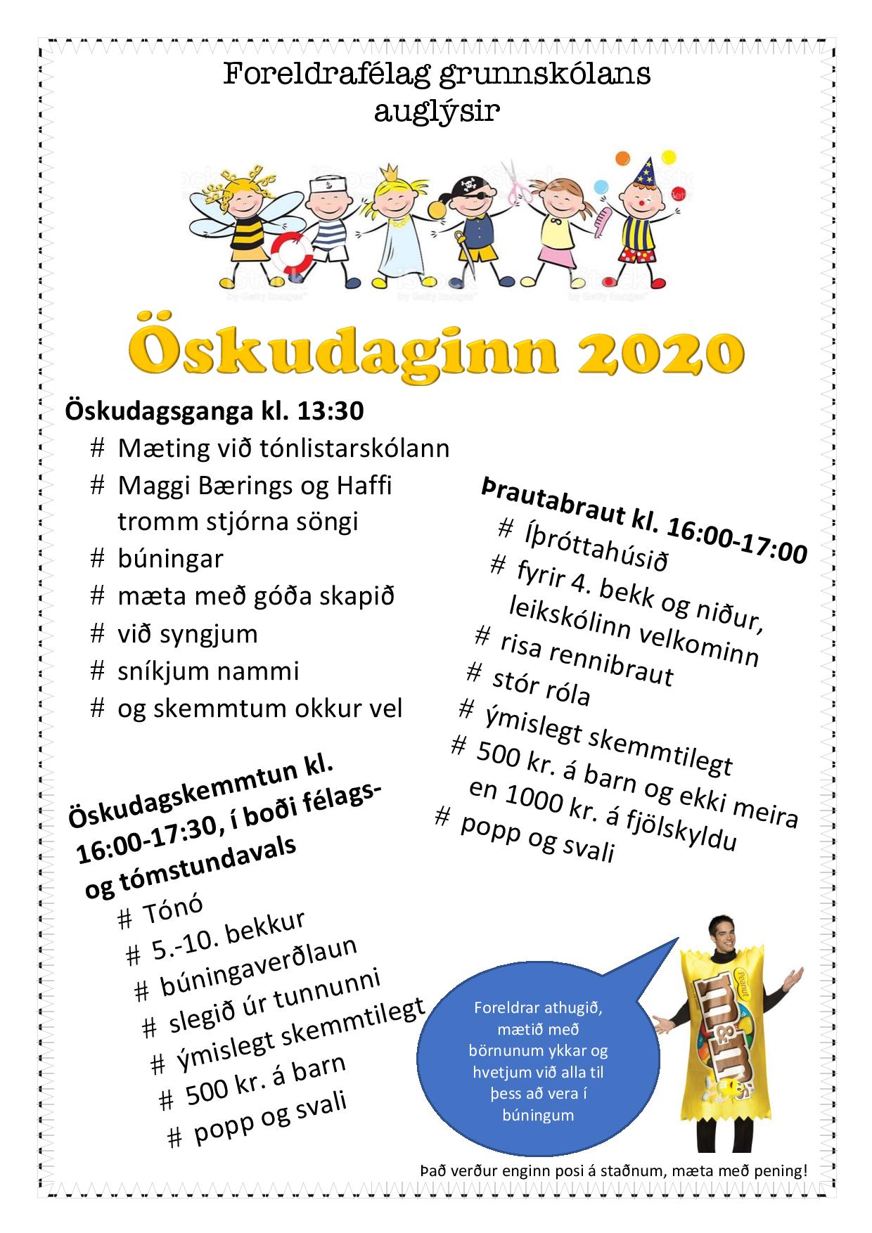 Næstkomandi miðvikudag, 26. febrúar, verður öskudagurinn haldinn hátíðlegur um land allt. Í Stykkishólmi stendur foreldrafélag grunnskólans fyrir fjölbreyttri og skemmtilegri dagskrá.