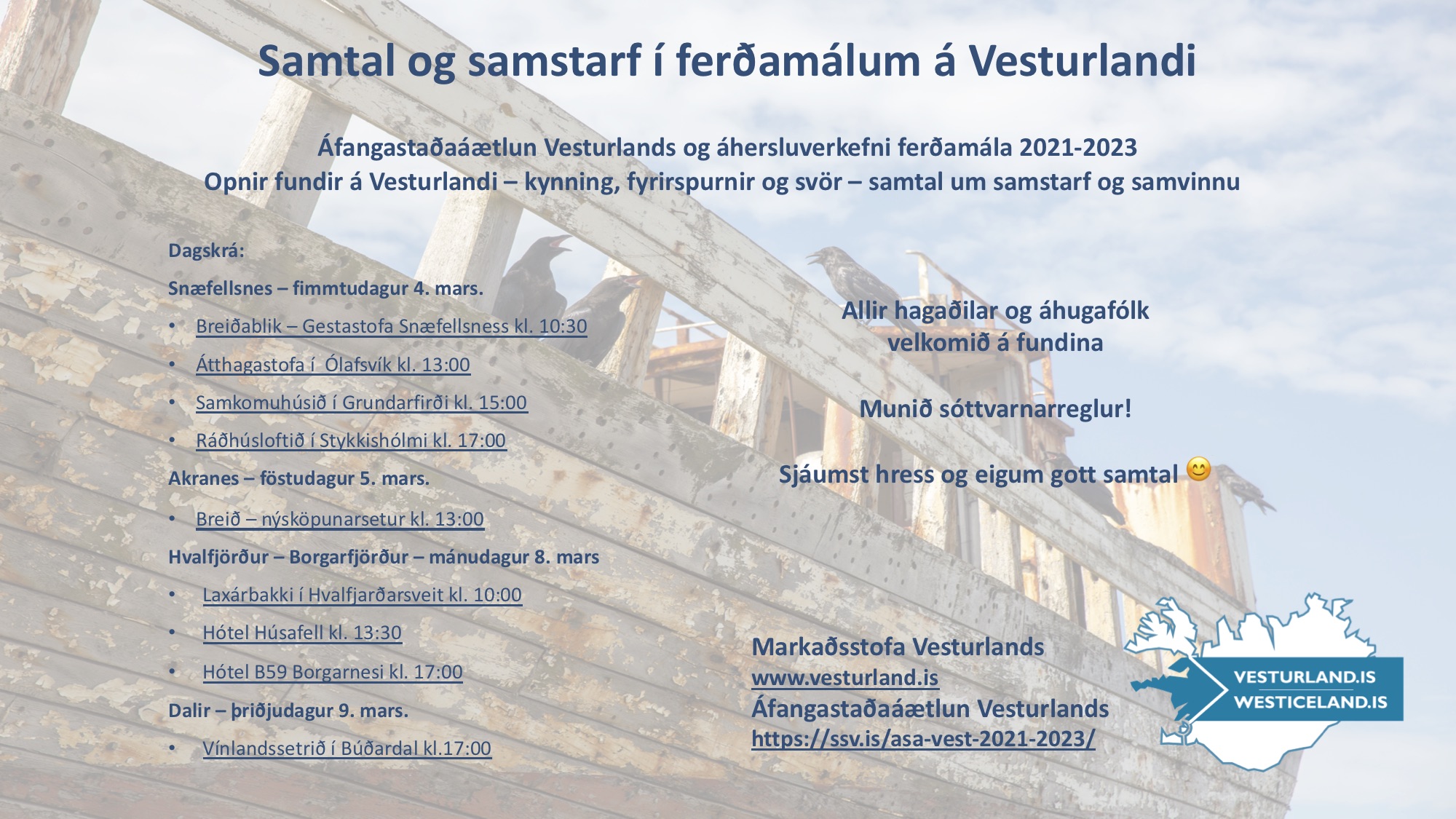 Starfsfólk Markaðsstofu Vesturlands leggur land undir fót og heimsækir svæðin á næstu dögum. Þau verða í Ráðhúsi Stykkishólms fimmtudaginn 4. mars kl 17:00. Kynnt verður Áfangastaðaáætlun Vesturlands og áhersluverkefni ferðamála 2021-2023.