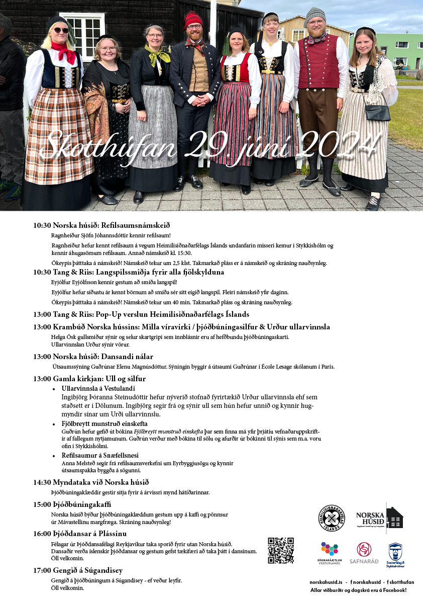 Skotthúfan fer fram í Stykkishólmi laugardaginn 29. júní 2024. Þjóðbúningahátíðin Skotthúfan hefur fest sig í sessi hér í Hólminum og setur hún fagran brag á annars fallegan bæ þegar áhugafólk af öllu landinu heimsækir Stykkishólm í sínu fínasta pússi. Byggðasafn Snæfellinga- og Hnappdæla hefur veg og vanda að hátíðinni og hefur fóstrað hana frá fyrstu tíð í Norska húsinu, elsta tvílyfta timburhúsi á Íslandi. Fyrsti þjóðbúningadagurinn í Norska húsinu var haldinn 2005 og nafnið Skotthúfan tekið upp árið 2014. Síðan hefur verið bryddað upp á fyrirlestrum, tónleikum, smiðjum og balli í dagskránni og hefur við það myndast skemmtileg stemning meðal gesta.
