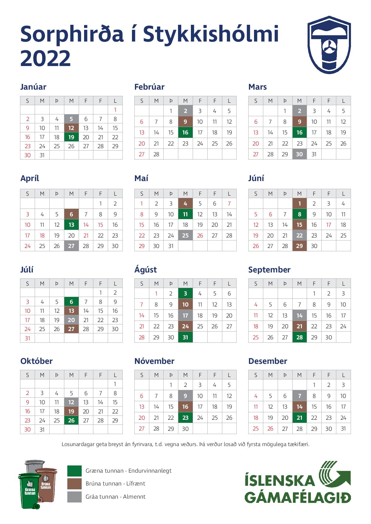 Vakin er athygli á því að dagatal Íslenska gámafélagsins fyrir sorphirðu í Stykkishólmi er komið út og má nálgast á vefsíðu Stykkishólmsbæjar. Losunardagar geta breyst án fyrirvara, t.d. vegna veðurs þó litlar líkur séu á því í veðursældinni í Stykkishólmi. En komi sú staða upp verður losað við fyrsta tækifæri.