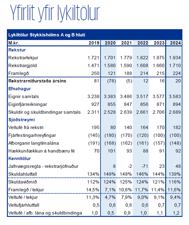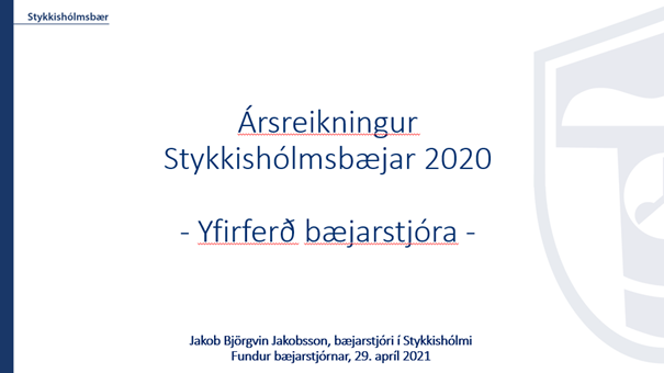 Á bæjarstjórnarfundi þann 12. maí sl. var ársreikningur Stykkishólmsbæjar fyrir árið 2020 samþykktur við síðari umræðu, en ársreikningurinn ber merki þess að síðasta ár var óvenjulegt vegna þess faraldurs sem við sem samfélag höfum verið að takast á við ásamt öðrum þjóðum. Rekstrartekjur samkvæmt ársreikningi fyrir A og B hluta námu 1.698,5 millj. kr. á árinu en þar af námu rekstrartekjur A hluta 1.322,6 millj. kr. Rekstrarniðurstaða A og B hluta var neikvæð um 74,6 millj. kr. en fjárhagsáætlun með viðaukum hafði gert ráð fyrir neikvæðri rekstrarniðurstöðu að fjárhæð 78,4 millj. kr. Á vormánuðum 2020 samþykkti bæjarstjórn Stykkishólmsbæjar fjárhagslegar og samfélagslegar aðgerðir Stykkishólmsbæjar til viðspyrnu og varna vegna Covid-19 sem fólu í sér fyrsta viðbragð sveitarfélagsins til að sporna við neikvæðum áhrifum heimsfaraldurs Covid-19 á samfélag og atvinnulíf í Stykkishólmi. Um var að ræða þrískiptar aðgerðir voru að ræða sem báru yfirskriftina: Unnið var eftir þessari aðgerðaráætlun í faraldrinum og þannig unnið markvisst að því að reyna að draga úr neikvæðum áhrifum faraldursins. Meðal aðgerða var aukið svigrúm til fyrirtækja hvað fasteignagjöld varðar og leiðrétting á þjónustugjöldum vegna skertar þjónustu. Breytingar voru jafnframt gerðar á fjárfestingaráætlun sem fól í sér áherslubreytingar á einstaka liðum í samræmi við samþykktar fjárhagslegar og samfélagslegar aðgerðir Stykkishólmsbæjar og þá var jafnframt tekið mið af þeim aðgerðum sem Alþingi hafði gripið til vegna heimsfaraldursins COVID-19, þ.m.t. endurgreiðsla á virðisaukaskatti. Helstu verkefni síðasta árs voru: Sjá nánar í yfirferð bæjarstjóra við fyrri umræðu er farið yfir helstu verkefni ársins 2020: Rekstrarniðurstaða A hluta var neikvæð um 167,4 millj. kr. en áætlanir með viðaukum höfðu gert ráð fyrir neikvæðri rekstrarniðurstöðu að fjárhæð 155,9 millj. kr. Í þessu sambandi er rétt að nefna að á árinu 2020 var samþykktur viðauki í bæjarstjórn sem fól í sér framlag Aðalsjóðs til Dvalarheimilisins í Stykkishólmi að fjárhæð 153,6 millj. kr. til uppgjörs á skuldum heimilisins gagnvart Aðalsjóði. Skuld þessi er til komin vegna fjármögnunar Aðalsjóðs á rekstrarhalla einingarinnar um all nokkurt skeið. Bæjarstjórn hafði á árinu 2018 áður fært til gjalda í Aðalsjóði varúðarniðurfærslu að fjárhæð 86 millj. kr. í samræmi við mat á innheimtanleika kröfunnar. Einsýnt þótti, í ljósi niðurstöðu sambærilegra mála á árinu 2020, að ekki væru líkur á að krafan innheimtist og því var tekin sú ákvörðun að veita fyrrgreint framlag til heimilisins. Að teknu tilliti til áhrifa þessa á rekstur A hluta Stykkishólmsbæjar á árinu 2020 væri rekstrarniðurstaða A hluta neikvæð um 99,8 millj. kr. Þrátt fyrir að rekstrarniðurstaða Stykkishólmsbæjar sé neikvæð á árinu 2020 þá náði sveitarfélagið þeim markmiðum sem sett voru í fjárhagsáætlun með viðaukum fyrr árið. Seinni umræða í bæjarstjórn Heildarfjárfesting A og B hluta á árinu 2020 nam 173,6 millj. kr. en áætlanir með viðaukum höfðu gert ráð fyrir 180 millj. kr. fjárfestingu árið 2020. Lántökur námu 310 millj. kr. og afborganir langtímalána námu 196,5 millj. kr. Skuldaviðmið A og B hluta Stykkishólmsbæjar í árslok 2020 er 122%, en til samanburðar var skuldaviðmið sveitarfélagsins 112% árið 2019, 120% árið 2018 og 138% árið 2017, og er rekstrarjöfnuður síðastliðinna þriggja ára jákvæður um 11,4 millj. kr. Faraldurinn og sóttvarnaraðgerðir ríkisins hafa haft víðtæk áhrif á mörgum sviðum, þar með talin efnahagsleg og hefur höggið í þeim efnum verið einna þyngst efnahagslega á ferðaþjónustuna og tengdar greinar, sem hafði áhrif á atvinnulíf og umsvif í Stykkishólmi í samræmi við það. Í upphafi faraldursins var reiknað með að faraldurinn myndi vara í skamman tíma en ljóst er að hann hefur dregist á langinn. Enn er ákveðin óvissa um hve lengi hann mun vara og hver heildar áhrifin verða eftir að honum lýkur, en nýlegar fréttir blása okkur von í brjósti um að við séum að sjá fyrir endann á honum. Við tekur þá ákveðið uppbyggingartímabil og vinna við að ná utan um ákveðna hópa sem faraldurinn hefur hefur lagst þyngst á, þ.m.t. heilsufarslega. Að baki er krefjandi ár í rekstri Stykkishólmsbæjar líkt og annarra félaga á þessum tímum. Bæjarstjóri og bæjarstjórn vill nota tækifærið og þakka starfsmönnum Stykkishólmsbæjar og íbúum þolgæði og þrautseigju á liðnu ári. Yfirferð KPMG á bæjarstjórnarfundi Hér má sjá ársreikning Stykkishólmsbæjar 2020 FJÁRHAGSÁÆTLUN 2021-2024 ? BJARTARI TÍMAR FRAMUNDAN Á bæjarstjórnarfundi þann 10. desember 2020 var samþykkt fjárhagsáætlun áranna 2021-2024. Í fjárhagsáætlun er lögð áhersla á ábyrga fjármálastjórnun þar sem gætt er aðhalds og ábyrgðar í rekstri bæjarins á sama tíma og leitast er við að halda þjónustu við bæjarbúa sem bestri. Megin markmið fjárhagsáætlunar 2021-2024 eru að tryggja jafnvægi í rekstri á tímabilinu, þ.e. skatt- og þjónustutekjur standi undir rekstri málaflokka og sjóða, að framlegð verði sem næst 12%, að veltufjárhlutfall nálgist 0,8 sem fyrst, handbært fé verði á bilinu 90-100 millj. kr. í árslok 2021 og rekstur skili nægjanlegum fjármunum til að standa undir afborgunum langtímalána. Jafnvægi í rekstri Markmið samþykktrar áætlunar er að framlegð verði sem næst 12% í árslok 2021. Áætlað er að framlegð verði 121 m.kr. eða sem nemur 7,1% á árinu 2020 en með markvissum aðgerðum er ætlunin að auka framlegð frá þeim tíma og að markmið náist á árunum 