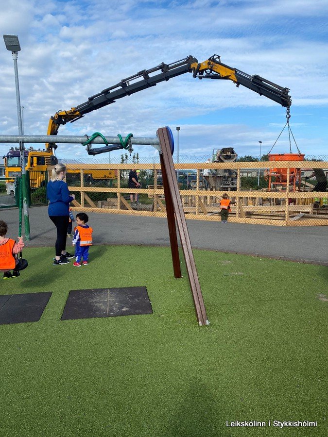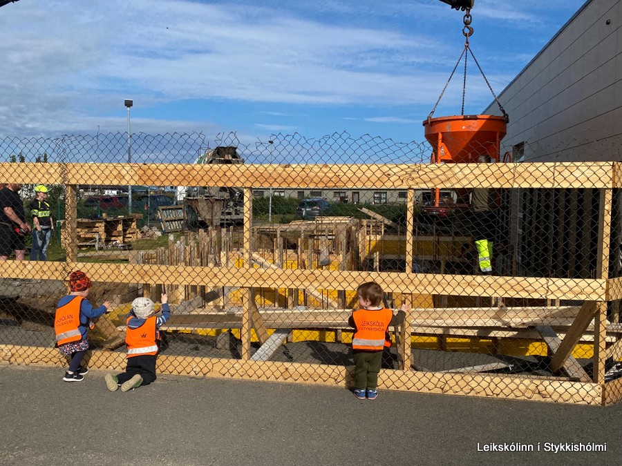 Í dag er verið að steypa sökkulinn á nýju viðbyggingunni í leikskólanum og eru vægast sagt mjög áhugasamir áhorfendur á svæðinu. Þetta verður spennandi dagur.