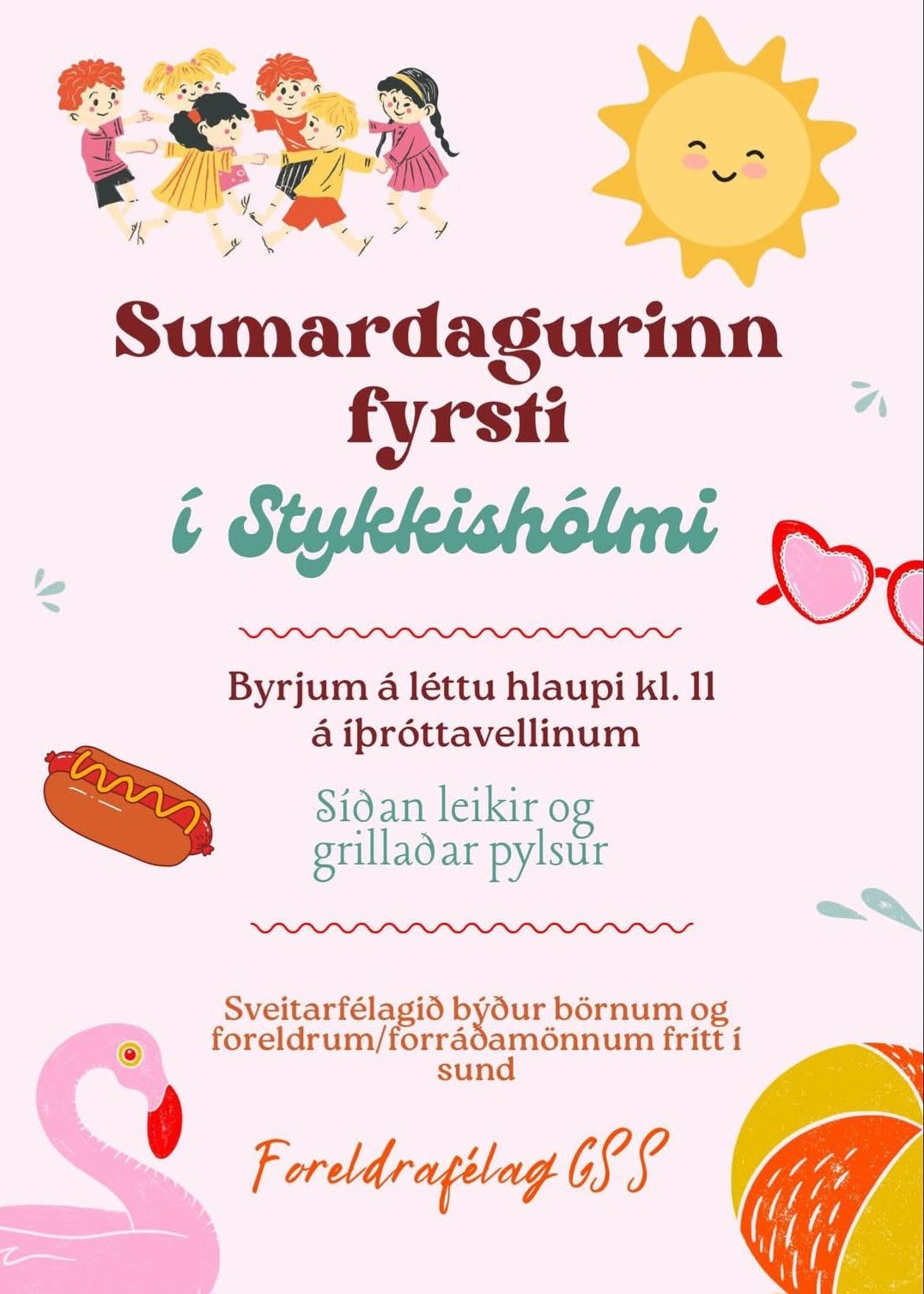 Sumardagurinn fyrsti verður haldin hátíðlegur um land allt fimmtudaginn 24. apríl. Verðurspá fyrir Stykkishólm gerir ráð fyrir 11 stiga hita, sól og mildri austangolu. Foreldrafélag Grunnskólans í Stykkishólmi stendur fyrir fjölskylduskemmtun af tilefni dagsins. Fjörið hefst kl. 11:00 á íþróttavellinum þar sem byrjað verður á léttu hlaupi áður en farið verður í leiki. Þá mun formaður foreldrafélagsins grilla pylsur fyrir börnin og leika um leið sínar alkunnu listir á grillspaðann.