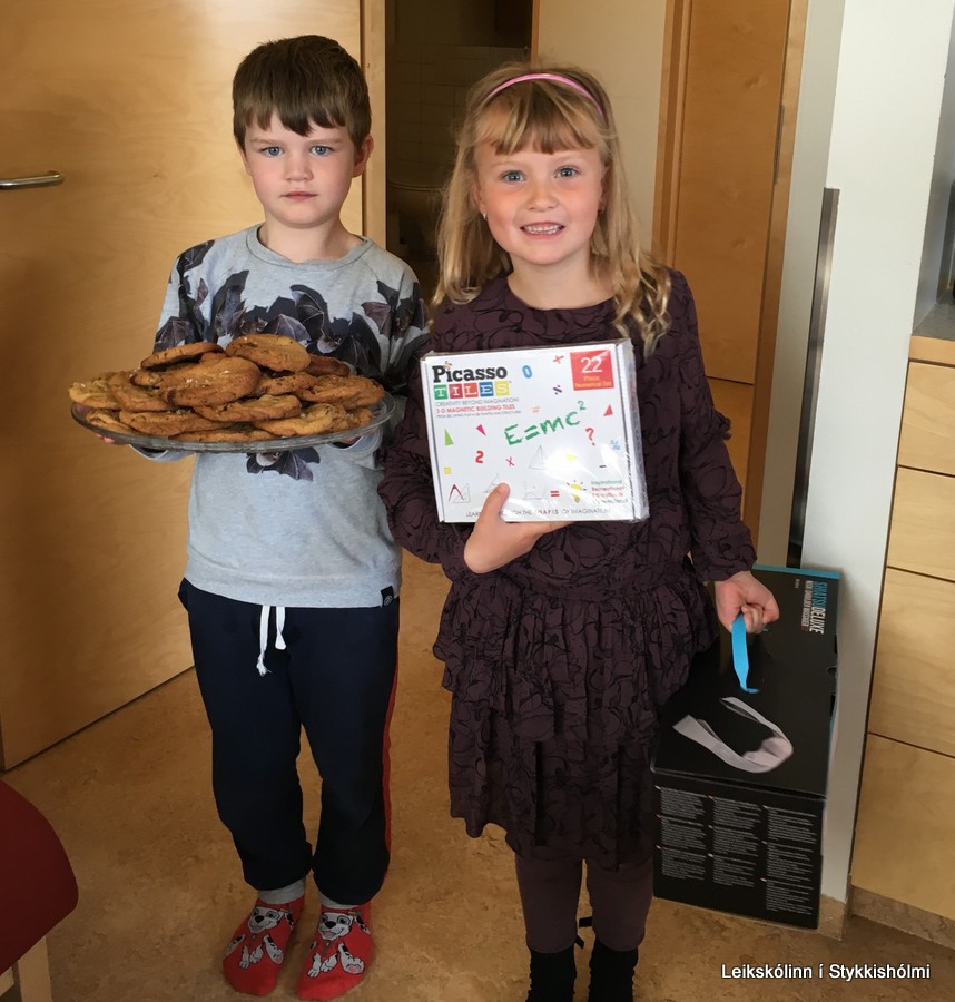 Í morgun komu fulltrúar útskriftarnemenda leikskólans ásamt mæðrum sínum með gjafir til bæði starfsmanna og nemenda leikskólans. Tilefnið var að þessa dagana eru þau að kveðja leikskólann sinn og færast yfir á næsta skólastig. Þau komu með dýrindis kökur á kaffistofuna og færðu starfsmönnunum nuddtæki sem strax var tekið í notkun og börnunum segulkubba.