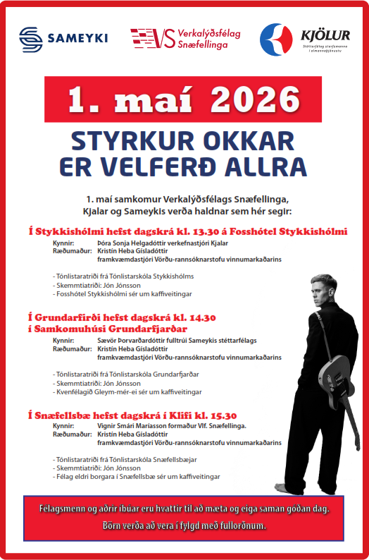 Verkalýðsdagurinn verður haldinn hátíðlegur 1. maí um land allt eins og vant er. i Verkalýðsfélag Snæfellinga, Kjölur og Sameyki standa fyrir hátíðahöldum á Snæfellsnesi. Dagskráin hefst í Stykkishólmi verður haldin á Fosshótel Stykkishólmi og hefst kl. 13:30.