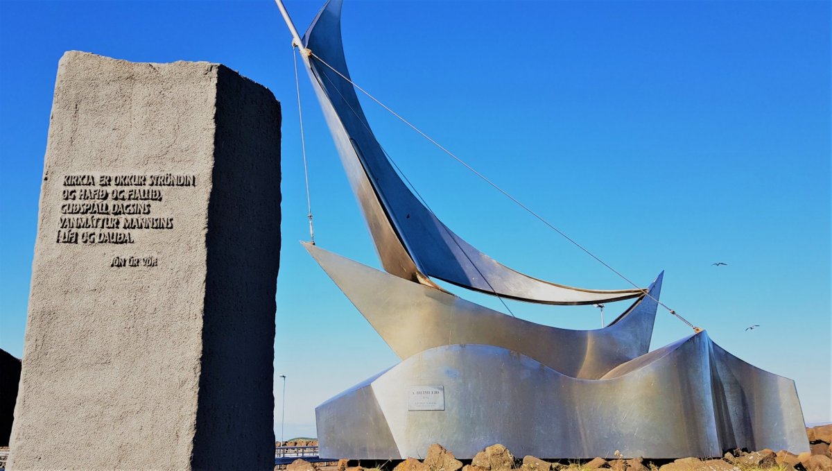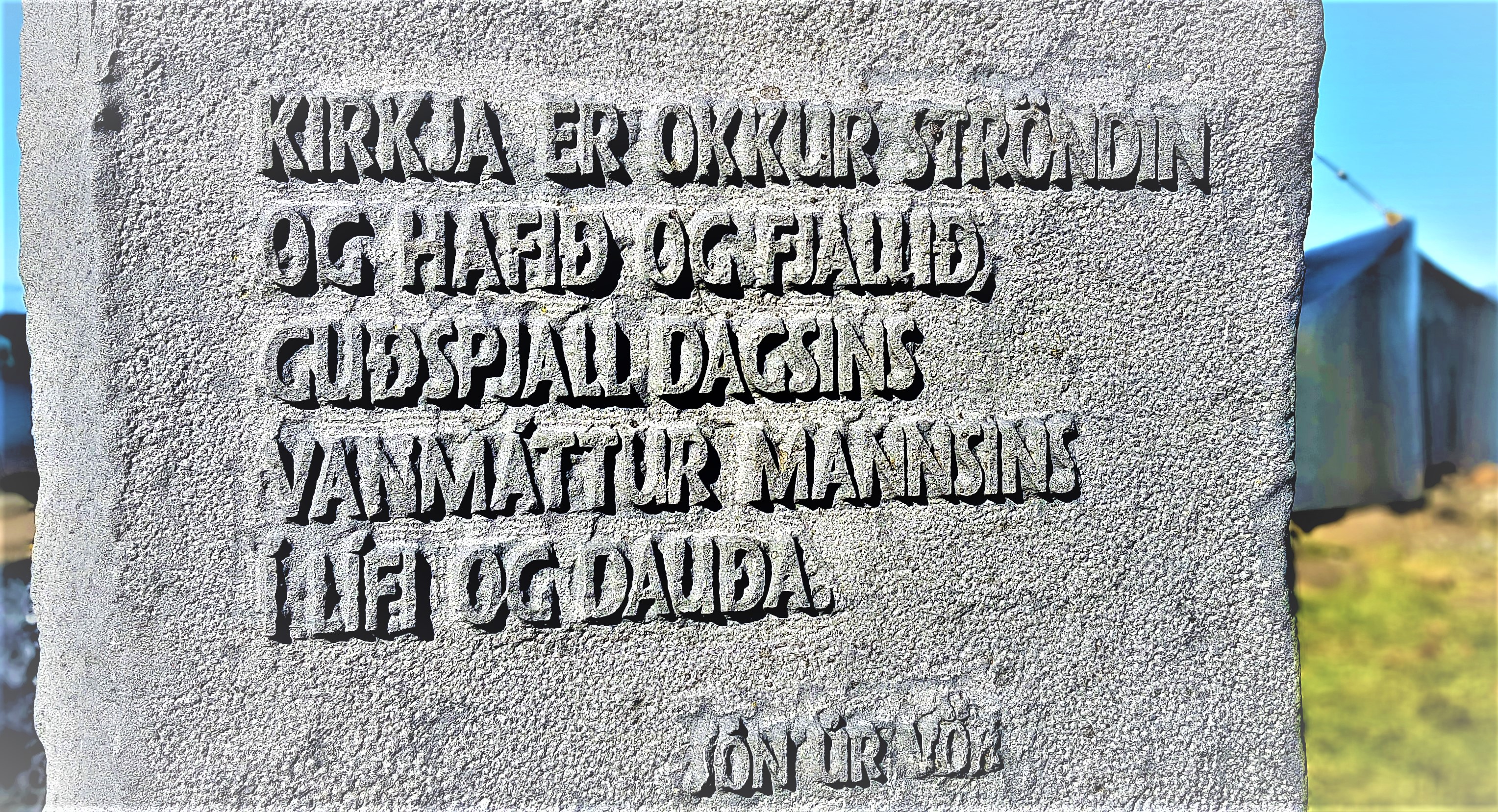 Hjá listaverkinu er tilvitnun í ljóð Jóns úr Vör: